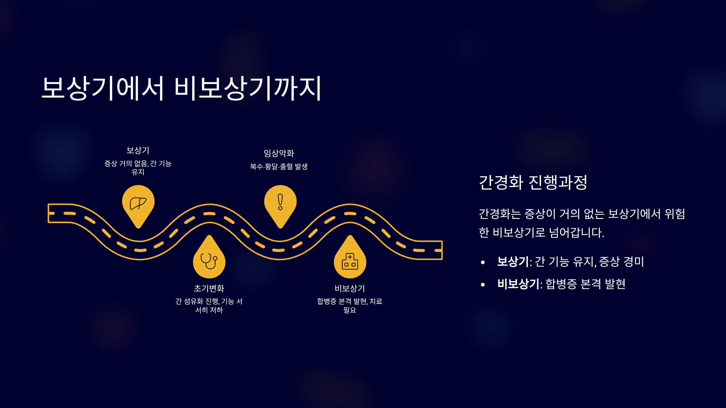 간경화는 증상이 거의 없는 보상기에서 위험한 비보상기로 넘어갑니다.
