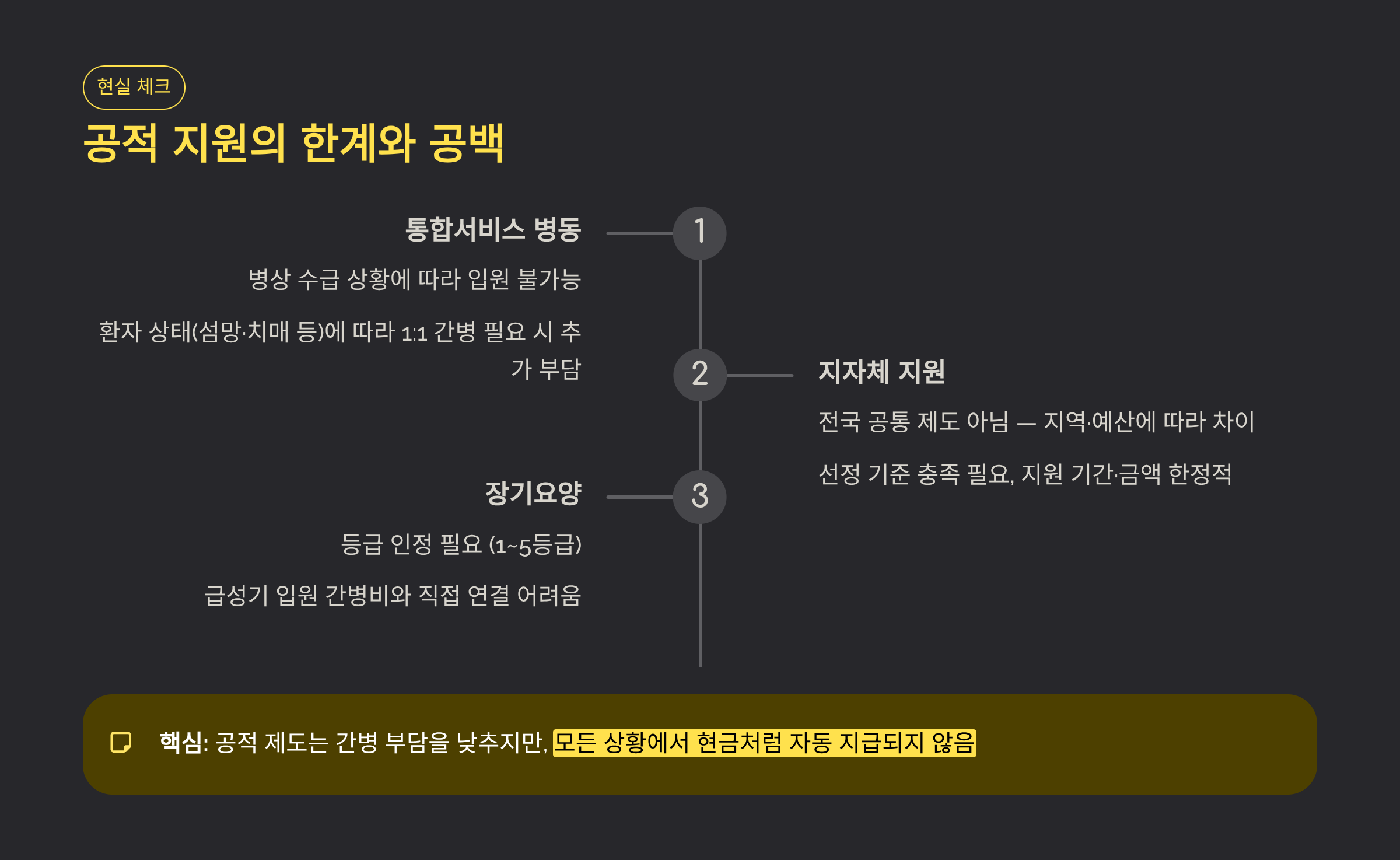 통합서비스·지자체 지원·장기요양으로 공적 바닥을 만들고, 공백 구간은 간병인 보험으로 메우는 게 가장 흔들리지 않습니다.