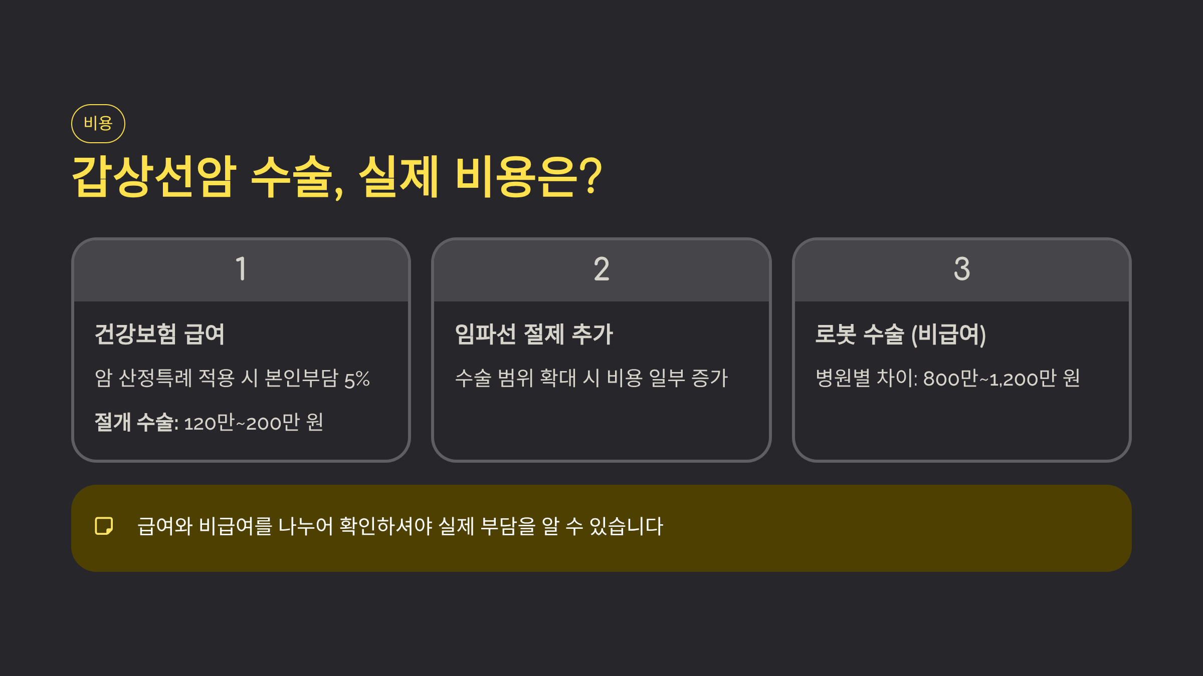 임파선 절제가 추가되면 비용은 일부 증가합니다. 로봇 수술은 비급여 항목으로 분류됩니다.