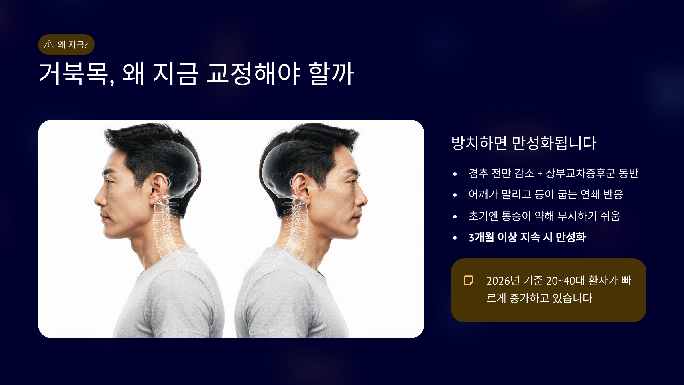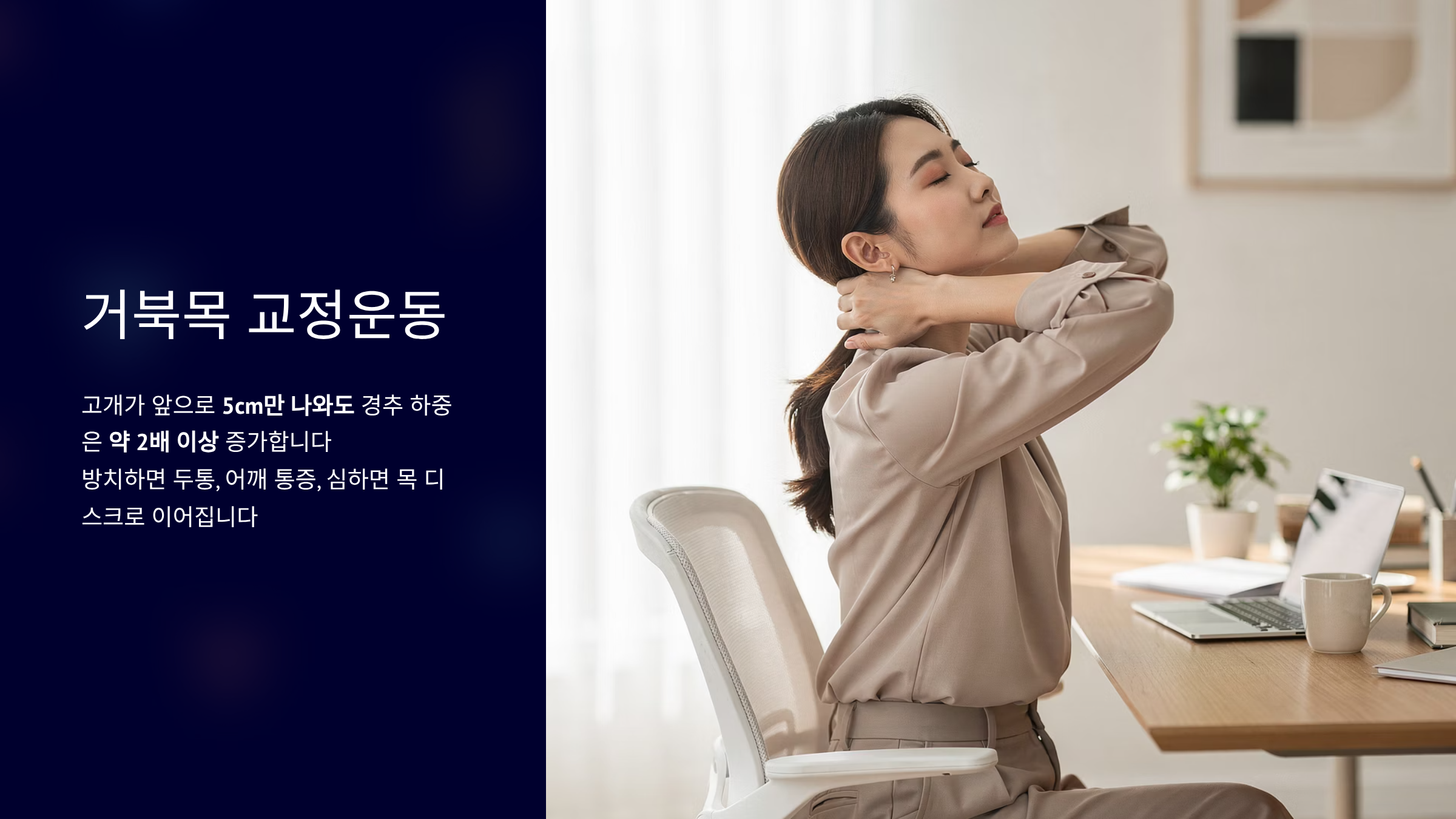 거북목을 방치하면 두통과 어깨 통증이 따라옵니다.