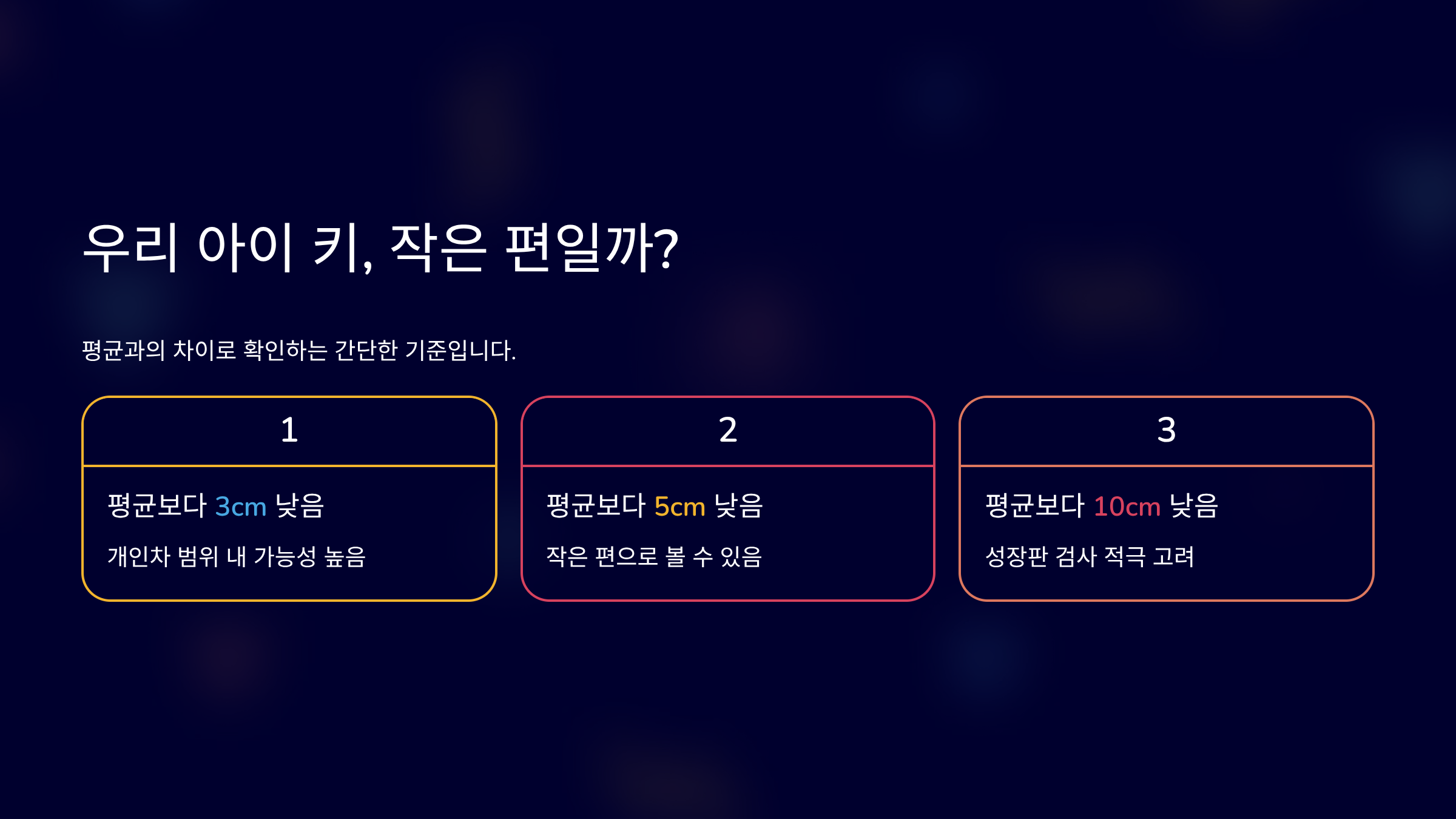 - 평균보다 10cm 낮음 → 성장 상담 고려