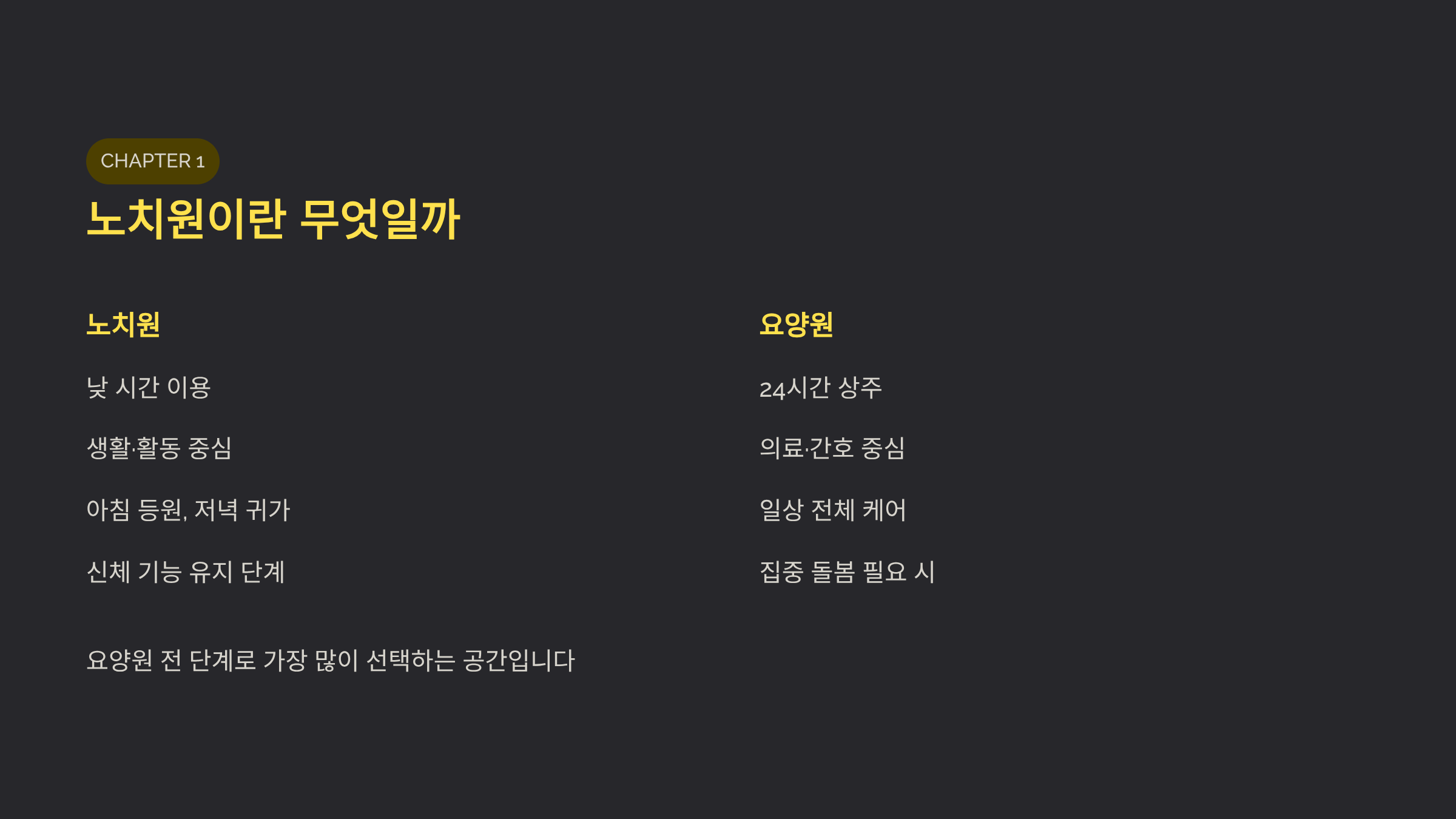 - 요양원: 상주 생활, 의료·간호 중심