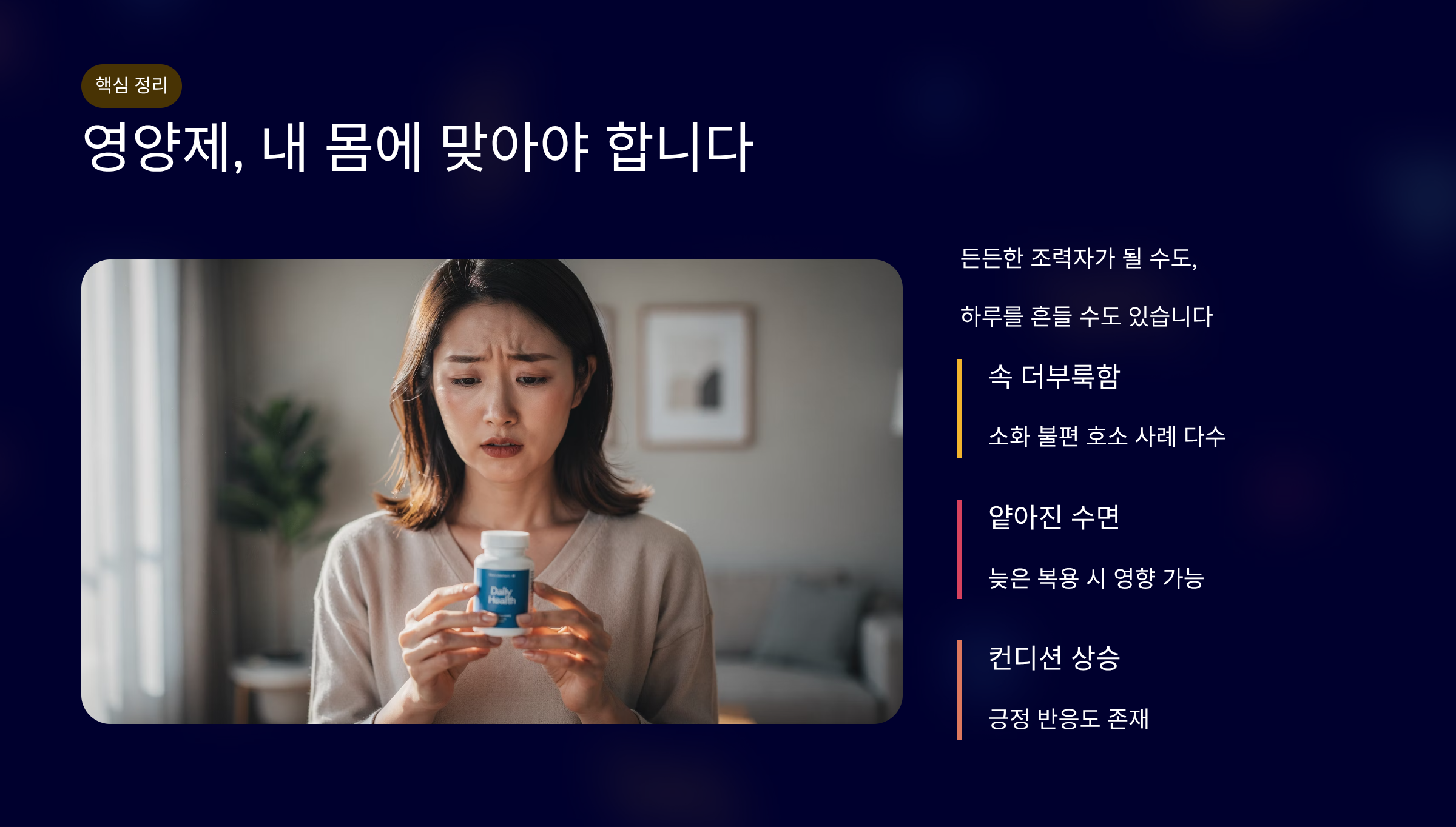 영양제는 내 몸에 맞으면 든든한데, 안 맞으면 하루가 꼬이기도 합니다.