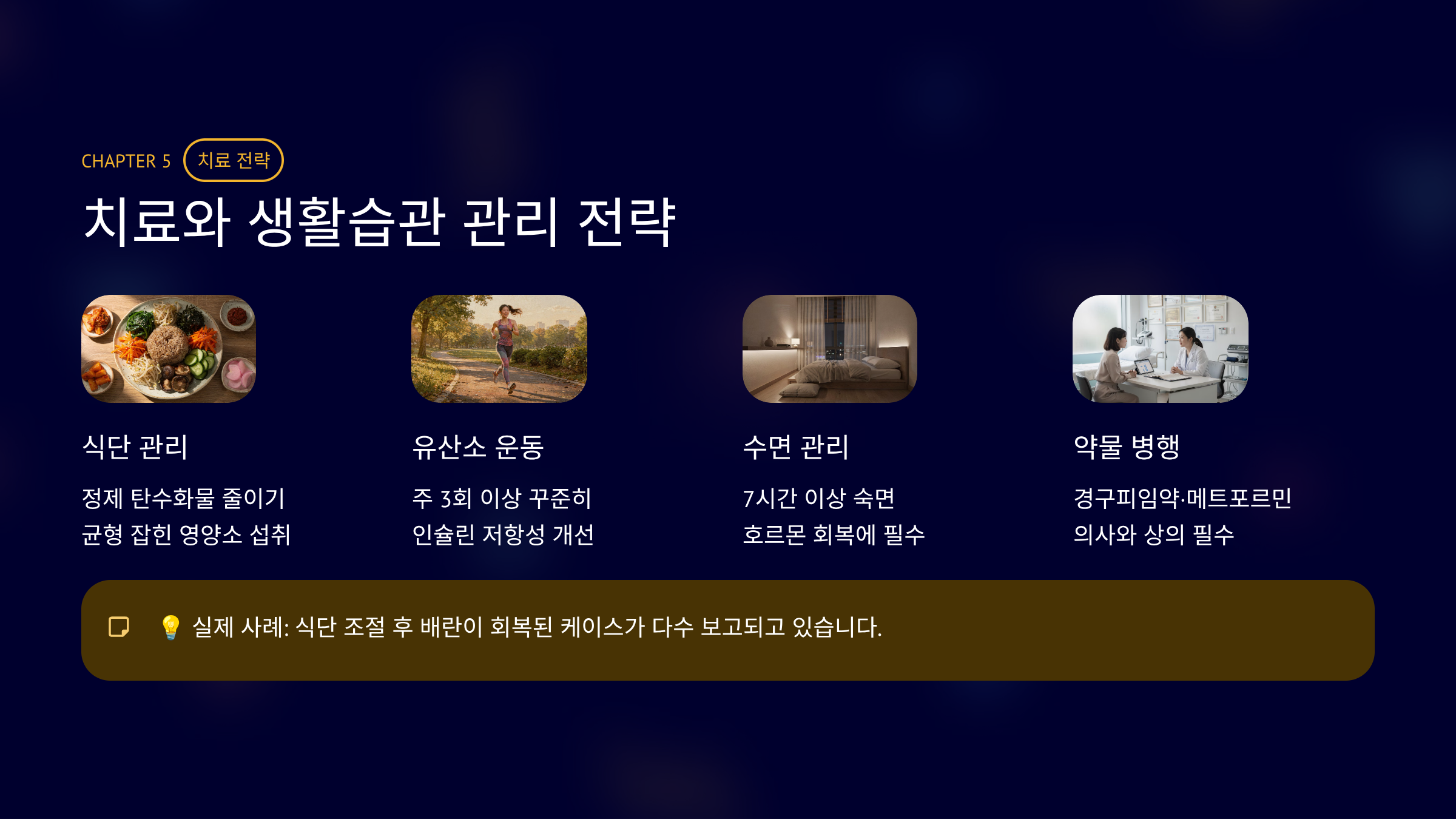 체중 5~10% 감량만으로 배란 개선 사례가 보고됩니다.