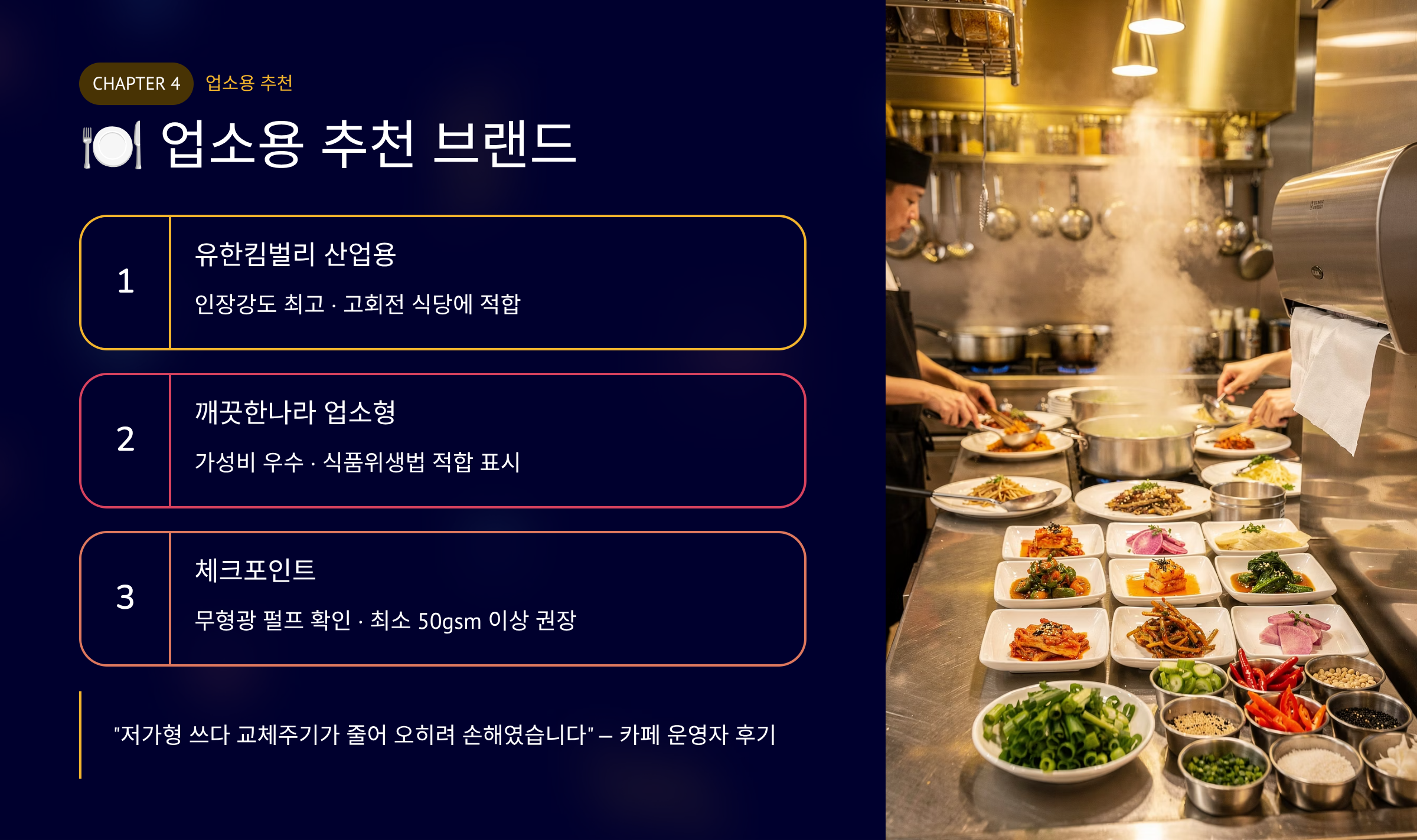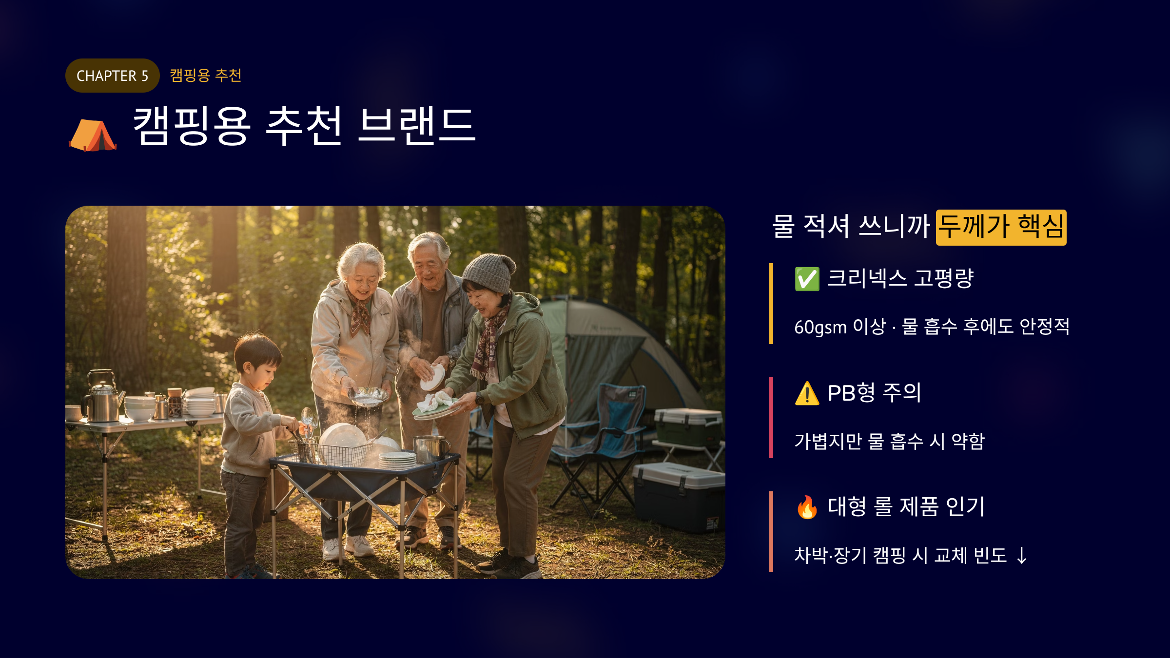 가정은 45gsm, 업소·캠핑은 50~60gsm 권장됩니다.