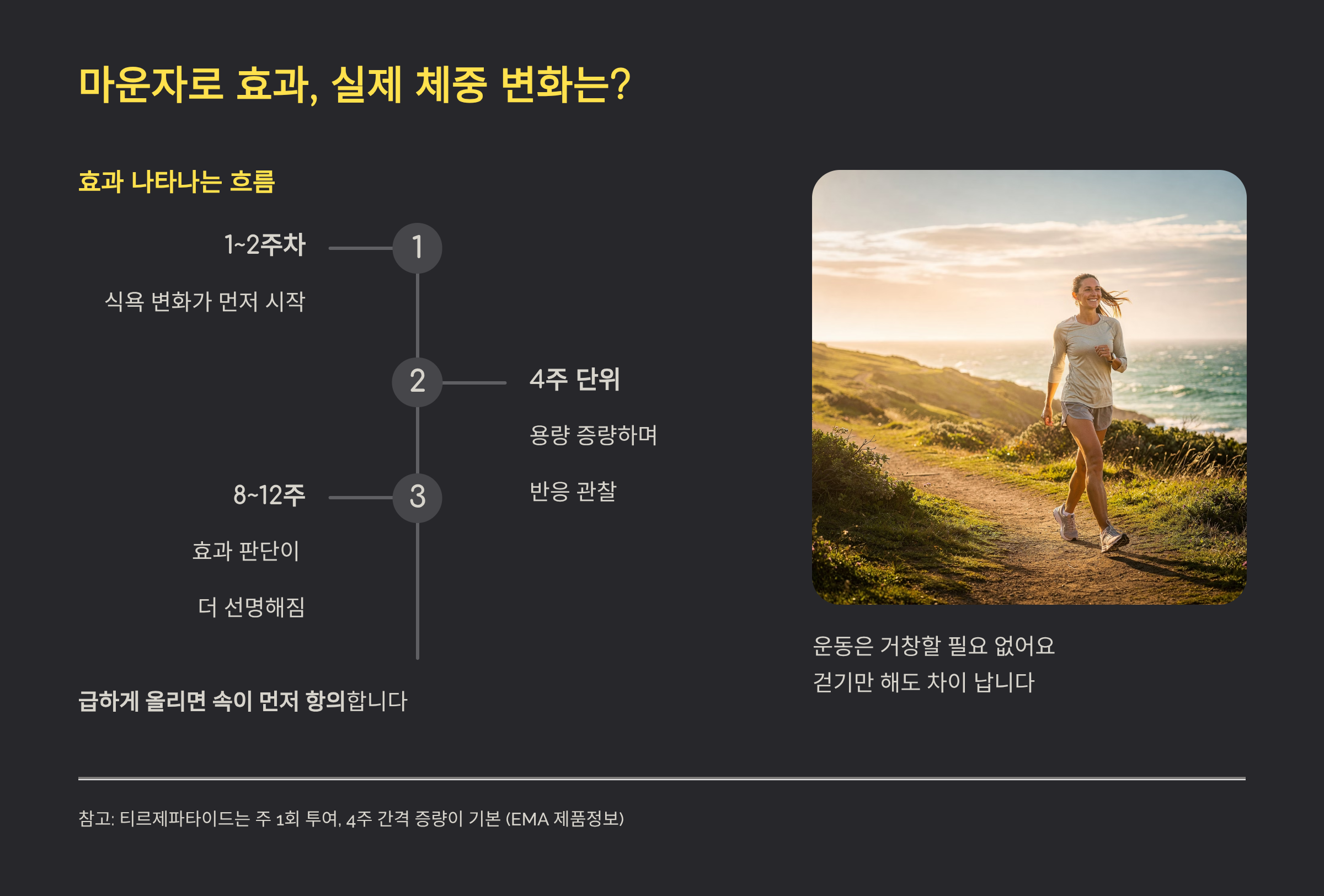 참고: 티르제파타이드는 주 1회 투여, 4주 간격 증량이 기본 구조로 안내돼요. (EMA 제품정보 2025~2026판)