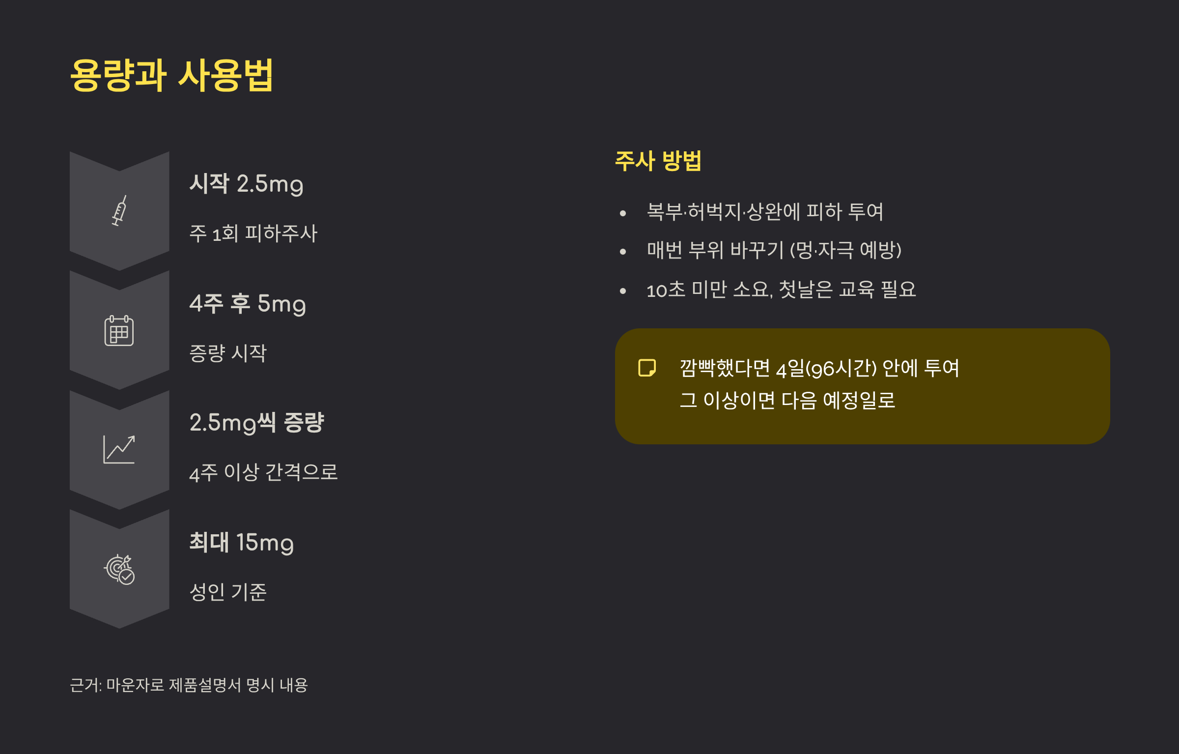 근거: 시작 2.5mg → 4주 후 5mg, 이후 2.5mg 단계 증량 및 96시간 규칙은 마운자로 제품설명서에 명시돼요.