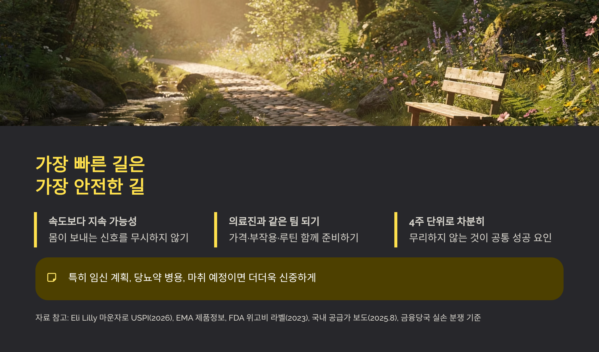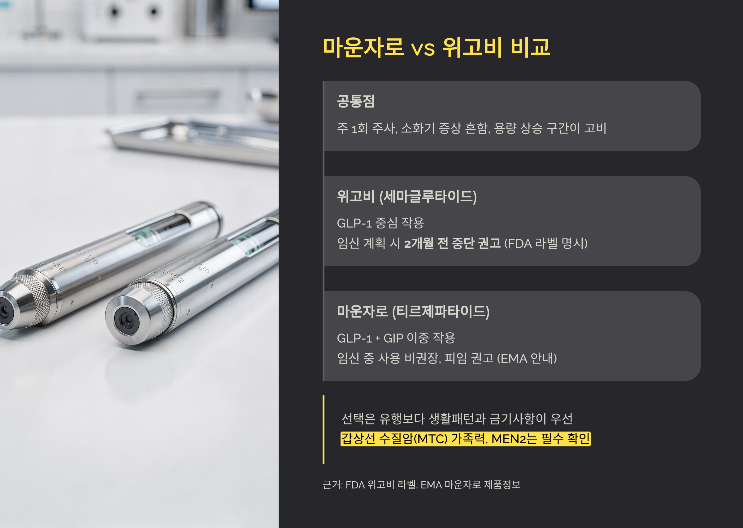 자료 참고(본문에 녹여쓴 근거): Eli Lilly 마운자로 USPI(2026년 1월 확인), EMA 마운자로 제품정보, FDA 위고비 라벨(2023년 개정본), 국내 마운자로 공급가 관련 보도(2025년 8월) 및 안내 자료, 금융당국의 실손보험 비급여 분쟁 기준 정비 관련 자료.