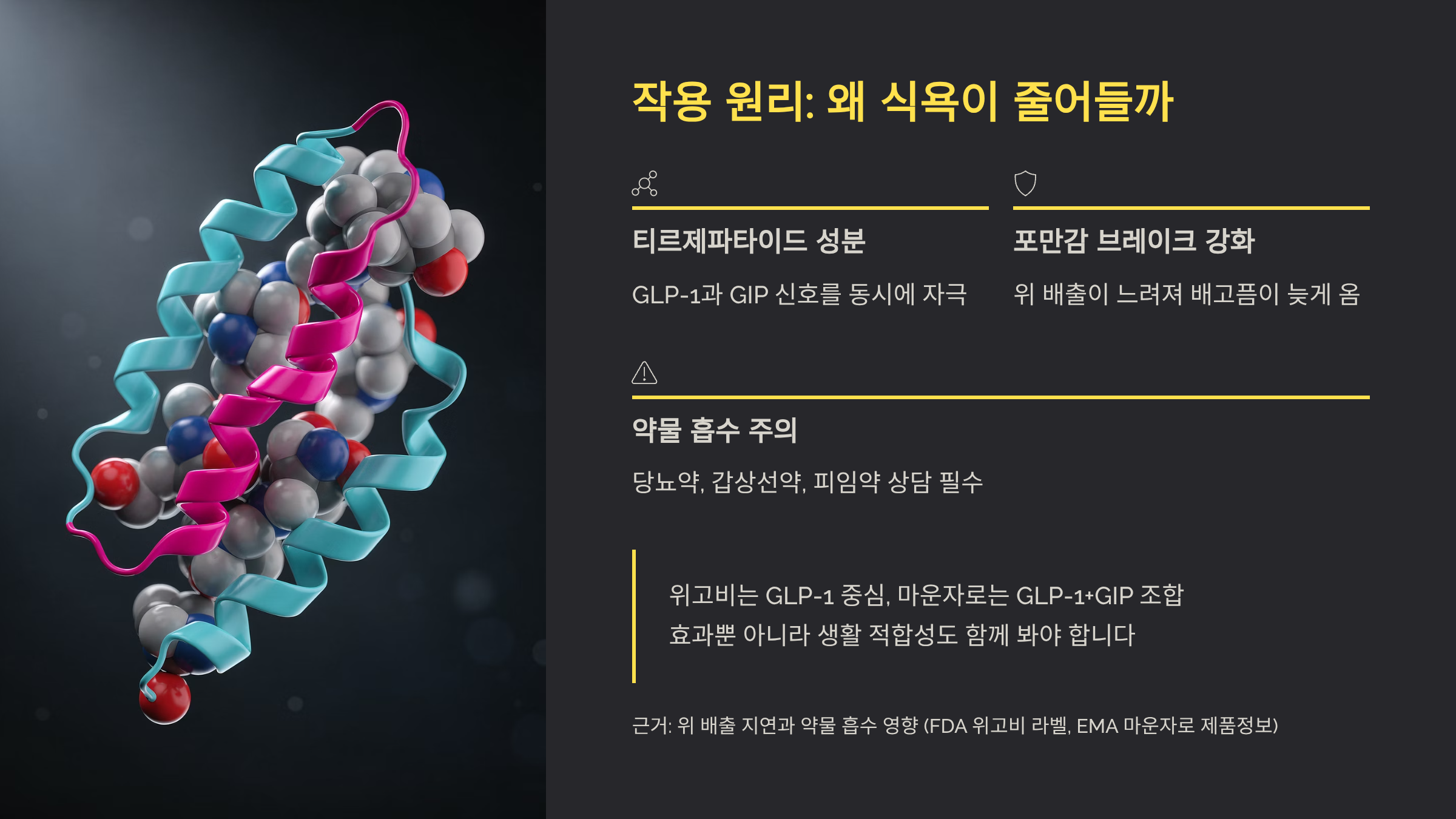 근거: 위 배출 지연과 약물 흡수 영향은 GLP-1 계열 라벨에 반복해서 나와요. (FDA 위고비 라벨, EMA 마운자로 제품정보)
