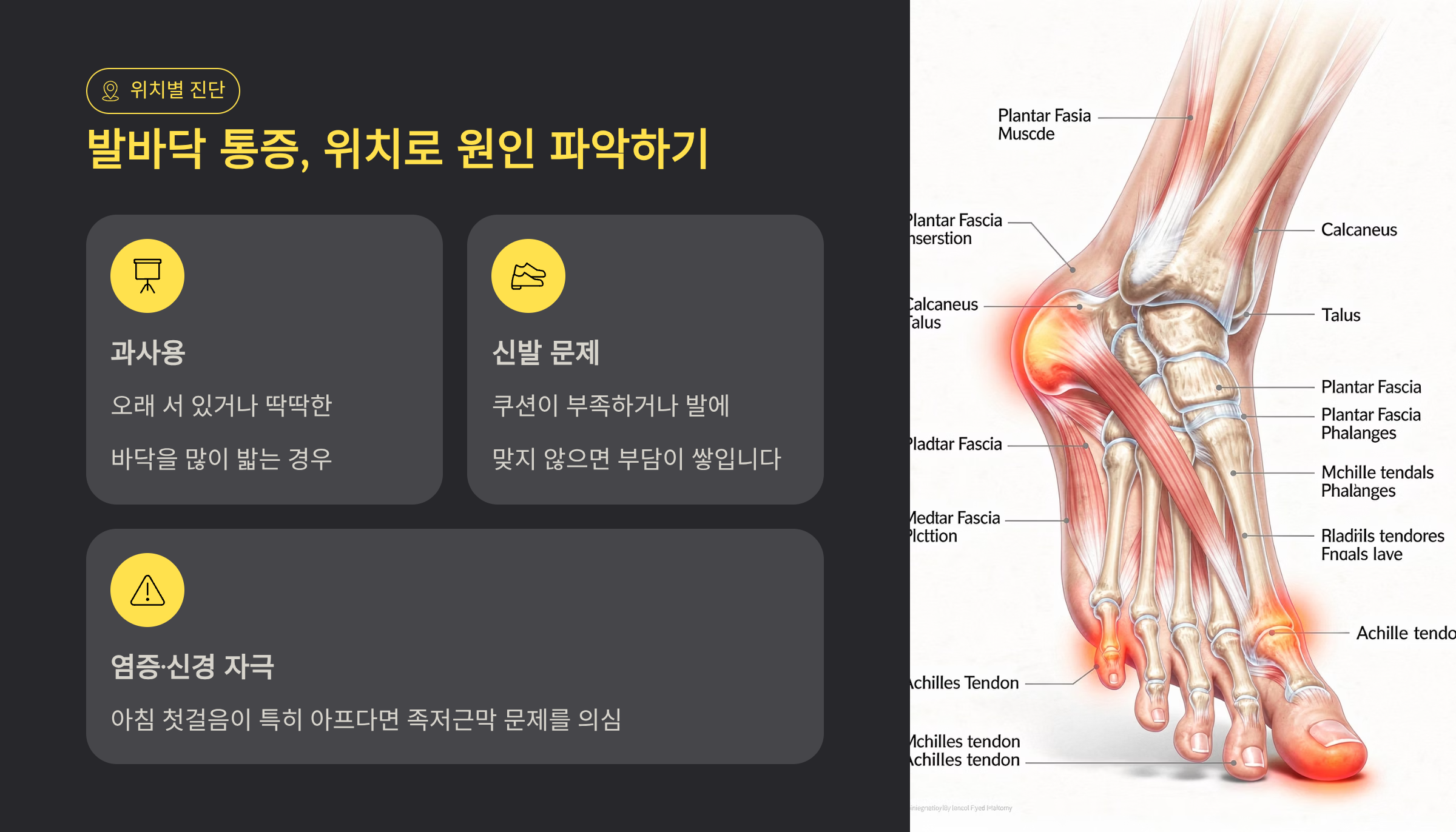 세 번째는 염증이나 신경 자극입니다. 아침 첫걸음이 특히 아프다면 족저근막 문제를 의심합니다.
