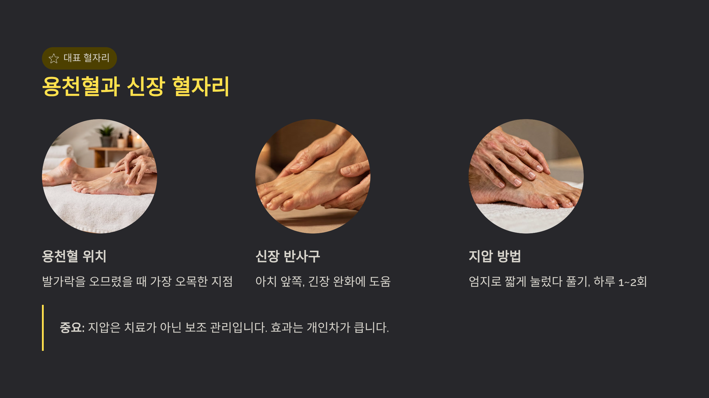 용천혈 지압 후 발이 따뜻해졌다는 분들도 계십니다. 다만 효과 체감은 개인차가 큽니다.