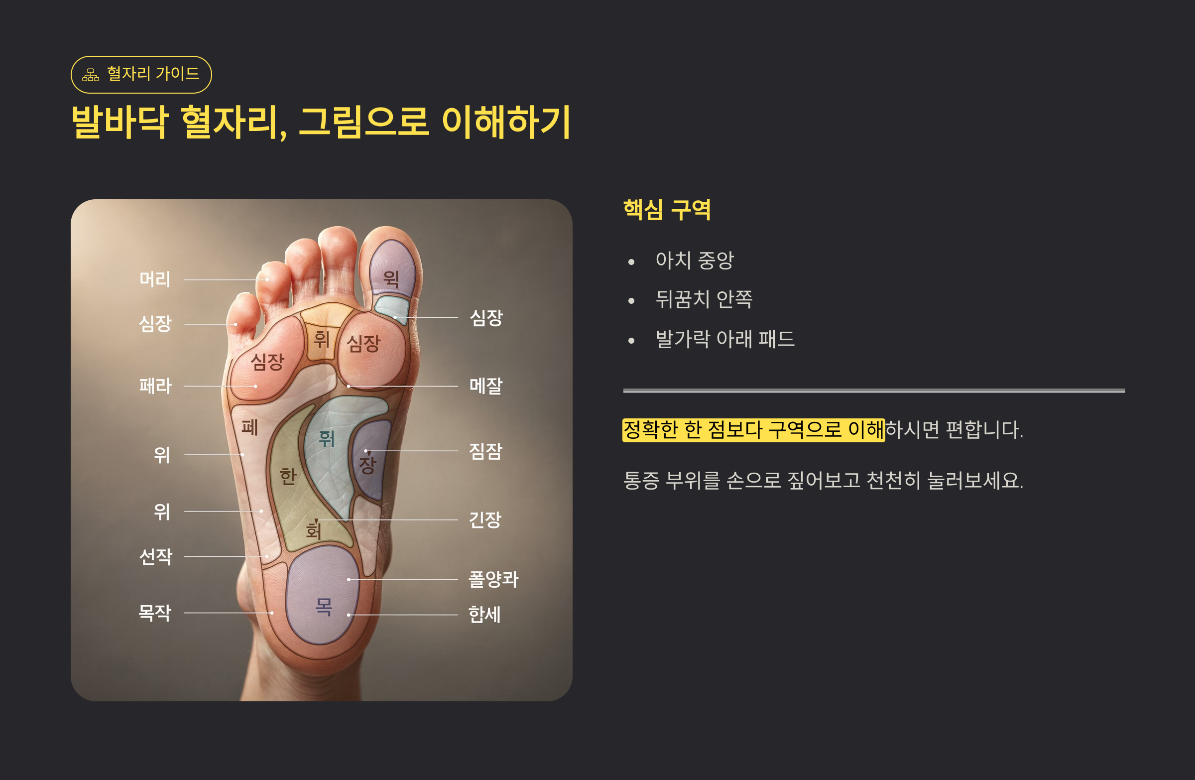 이때 많은 분들이 발바닥 혈자리를 떠올리십니다.