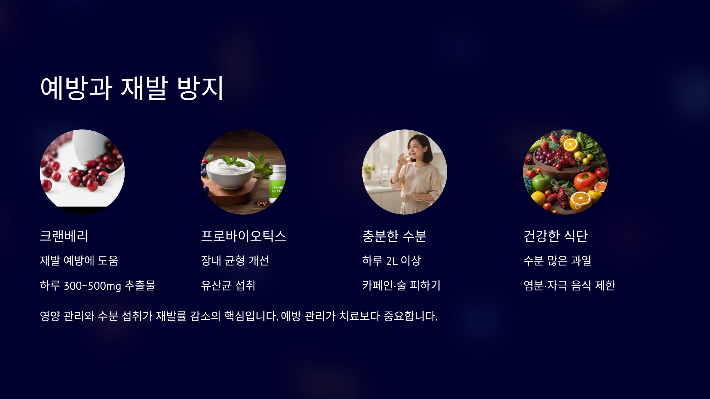 크랜베리는 재발 예방에 도움을 줍니다. 프로바이오틱스도 장내 균형을 개선합니다. 수분이 많은 과일 섭취도 도움이 됩니다.