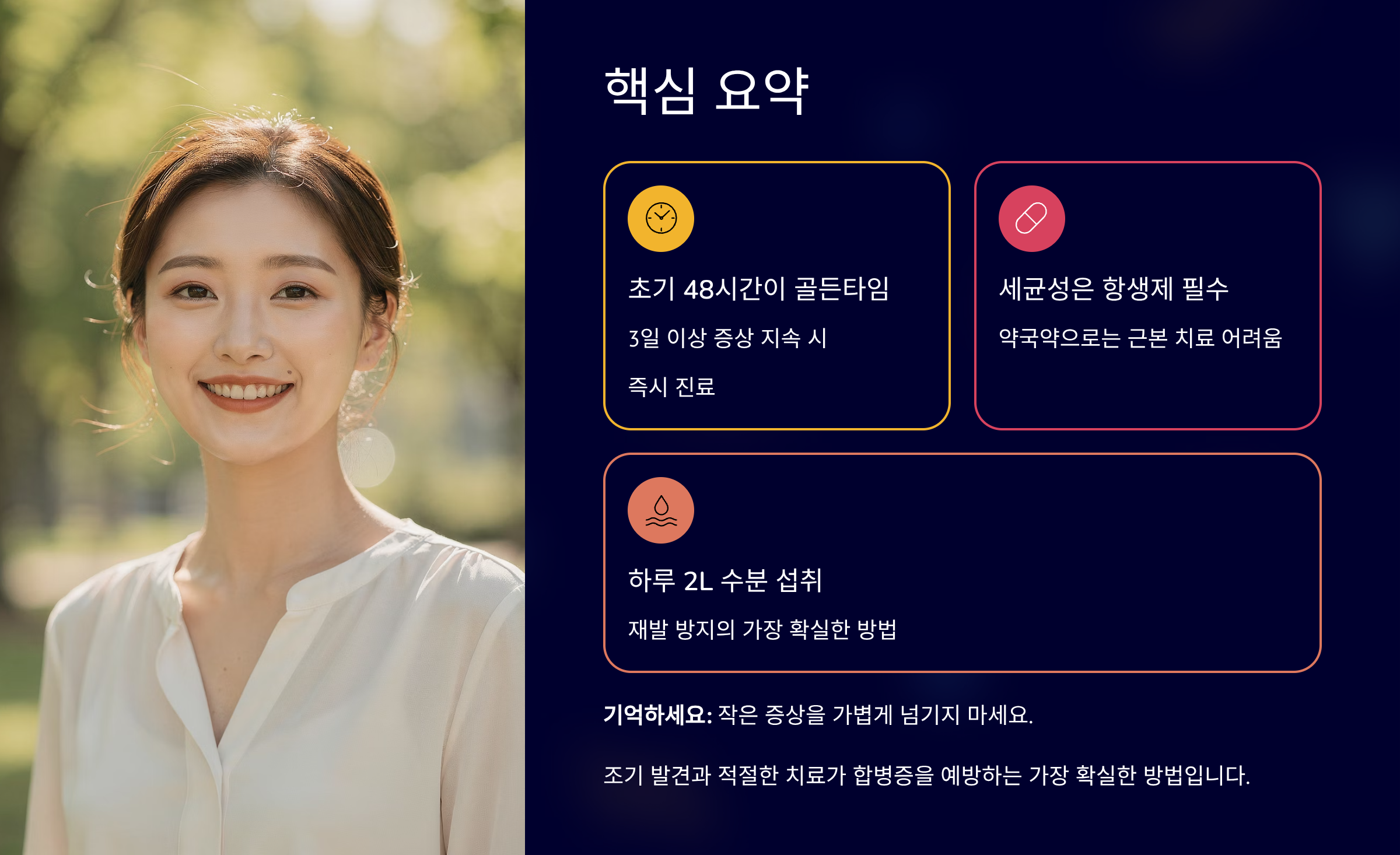 염분과 자극적 음식은 줄이세요. 영양 관리가 재발률 감소에 기여합니다. 예방 관리가 치료보다 중요합니다.