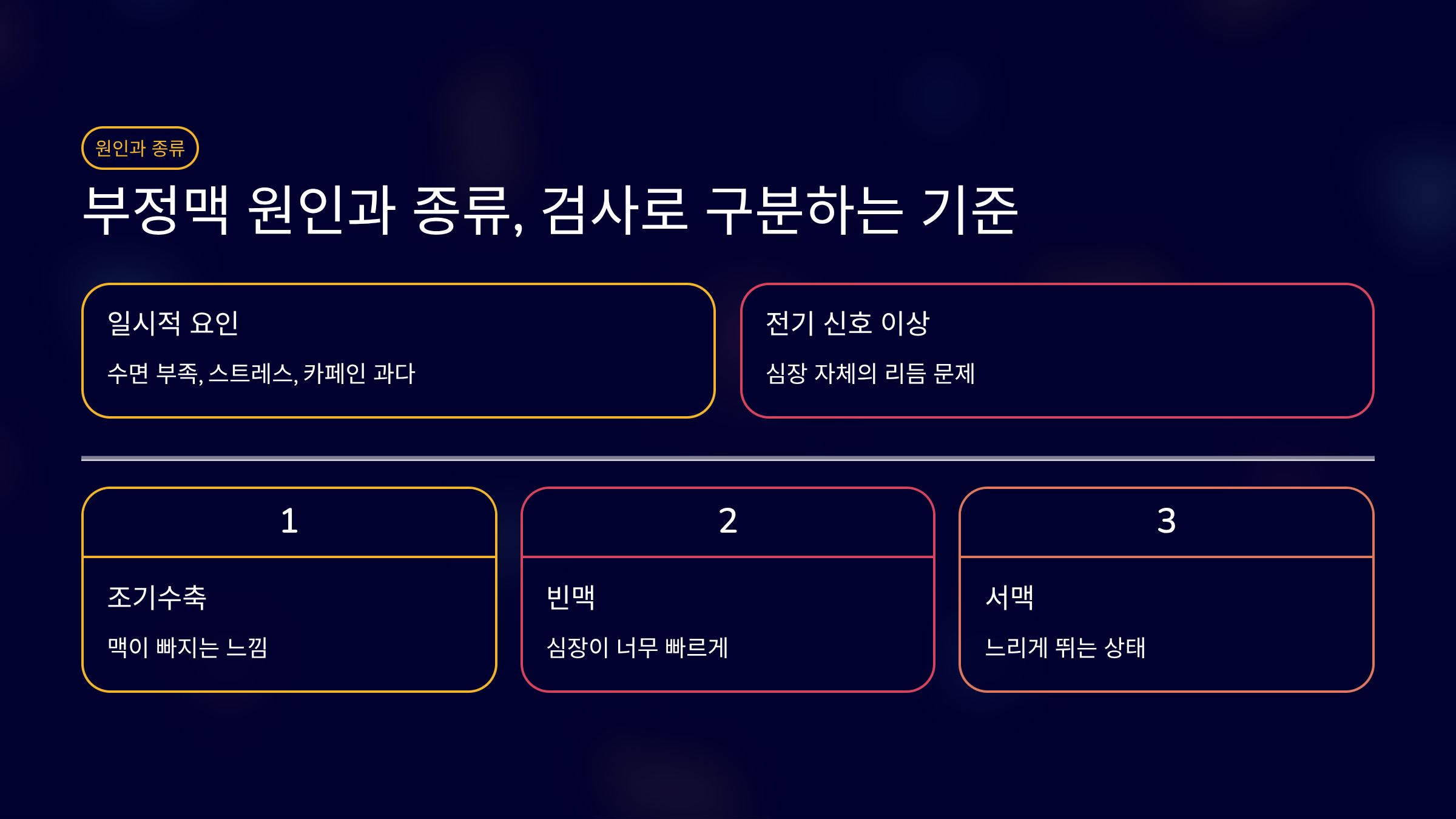 수면 부족, 스트레스, 카페인 과다처럼 일시적인 요인도 있고, 심장 자체의 전기 신호 이상이 원인이 되기도 합니다.