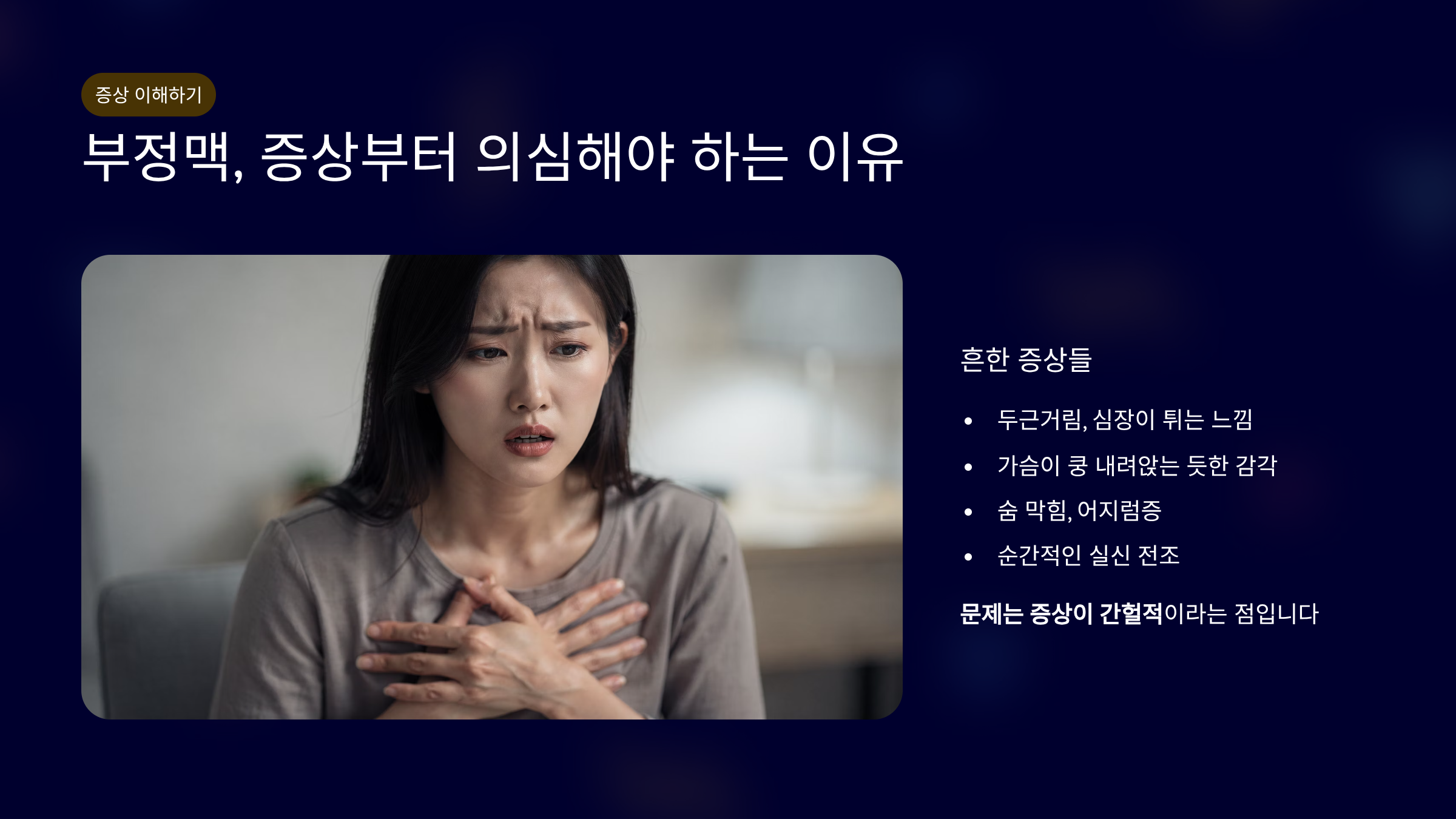 심장이 갑자기 빨라지거나, 순간적으로 멎는 느낌이 들 때가 있습니다.