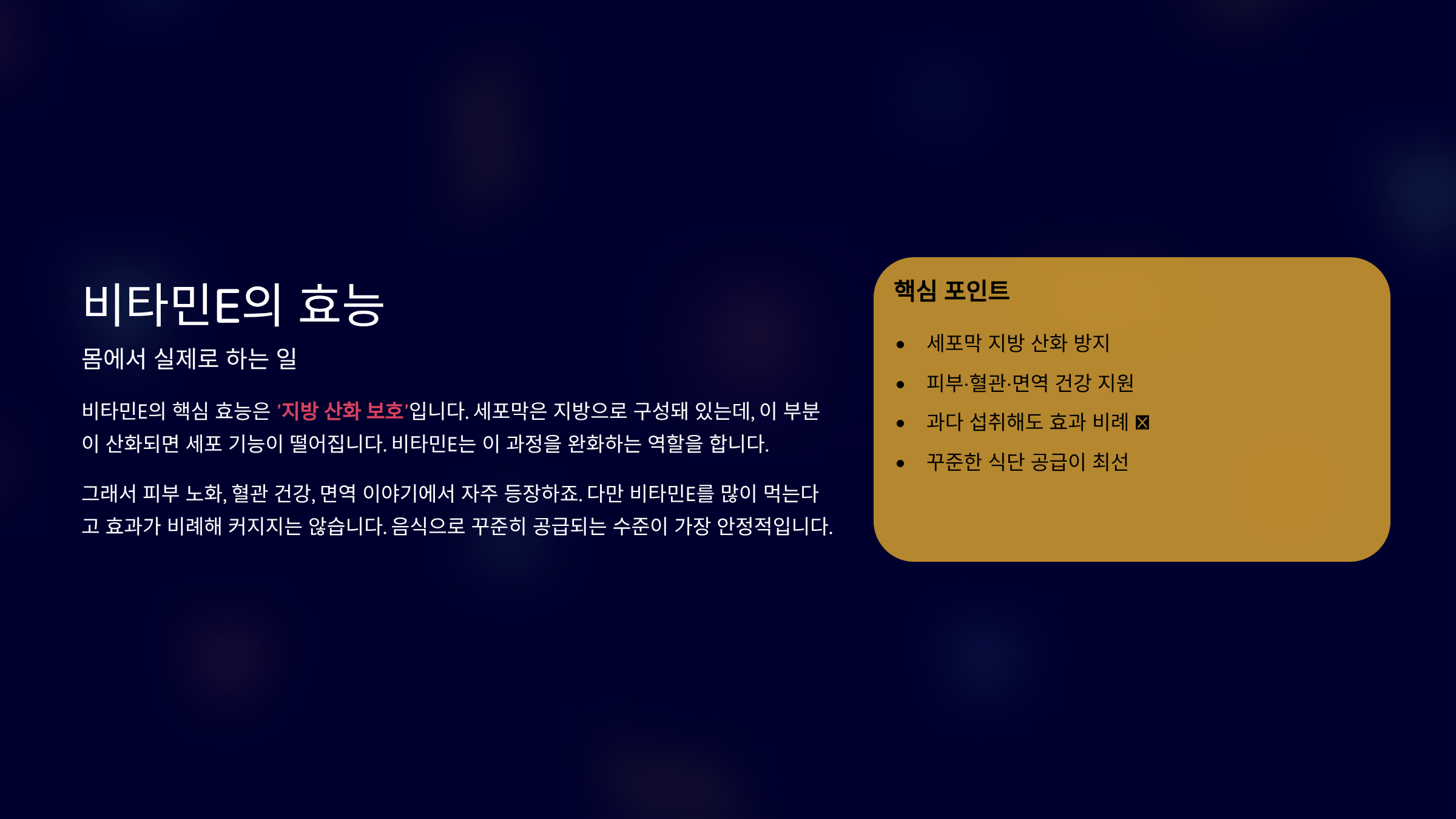 비타민E의 효능은 ‘지방이 산화되는 흐름’을 막아주는 쪽에 가깝습니다.