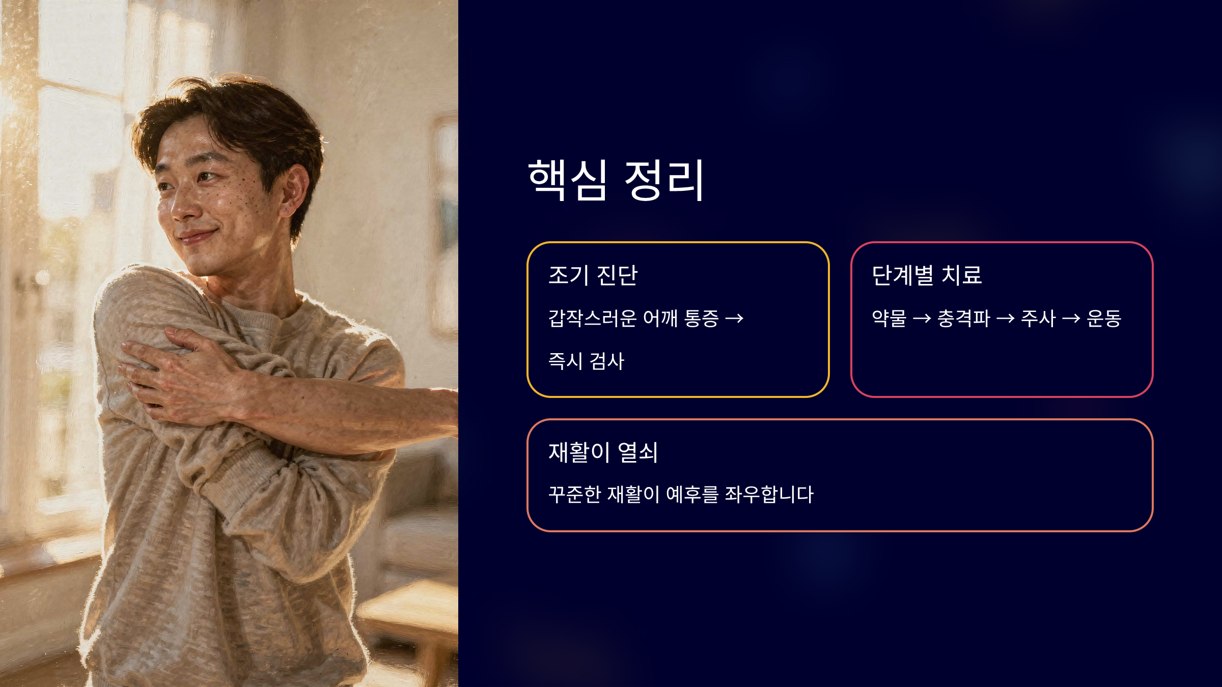 어깨 충돌증후군, 방치하면 수술까지 갑니다팔을 들 때마다 찌릿한 통증이 반복된다면 단순 근육통일까요. 어깨 충돌증후군은 초기에는 가벼운 통증처럼 시작됩니다. 하지만 치료 시기를 놓치