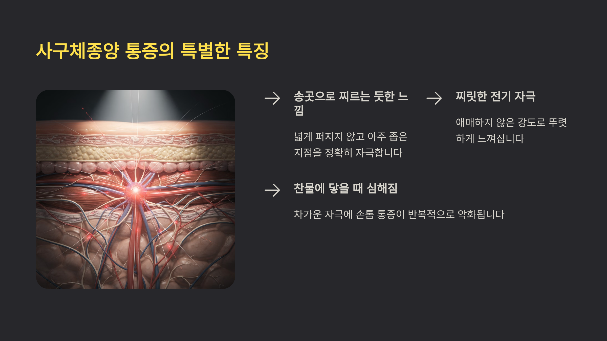 이런 특징은 근육통이나 염증처럼 범위가 넓은 통증과는 분명히 다릅니다.