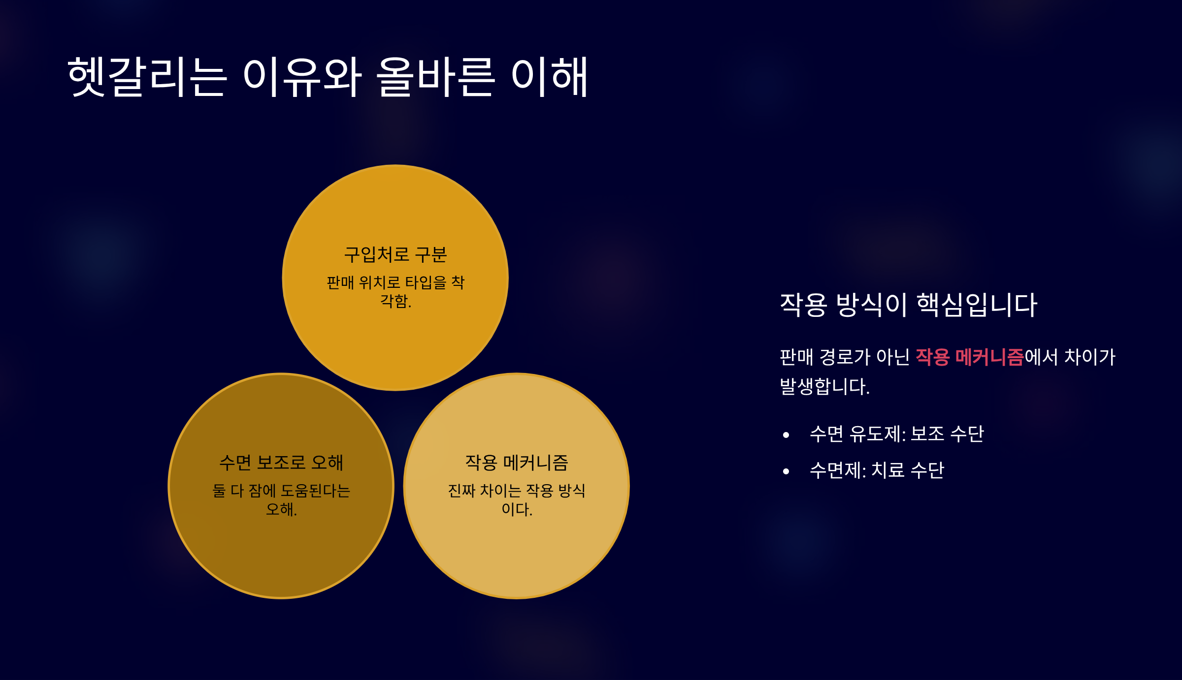 약국에서 구매하면 수면 유도제, 병원에서 받으면 수면제라고 단순화되곤 하죠.