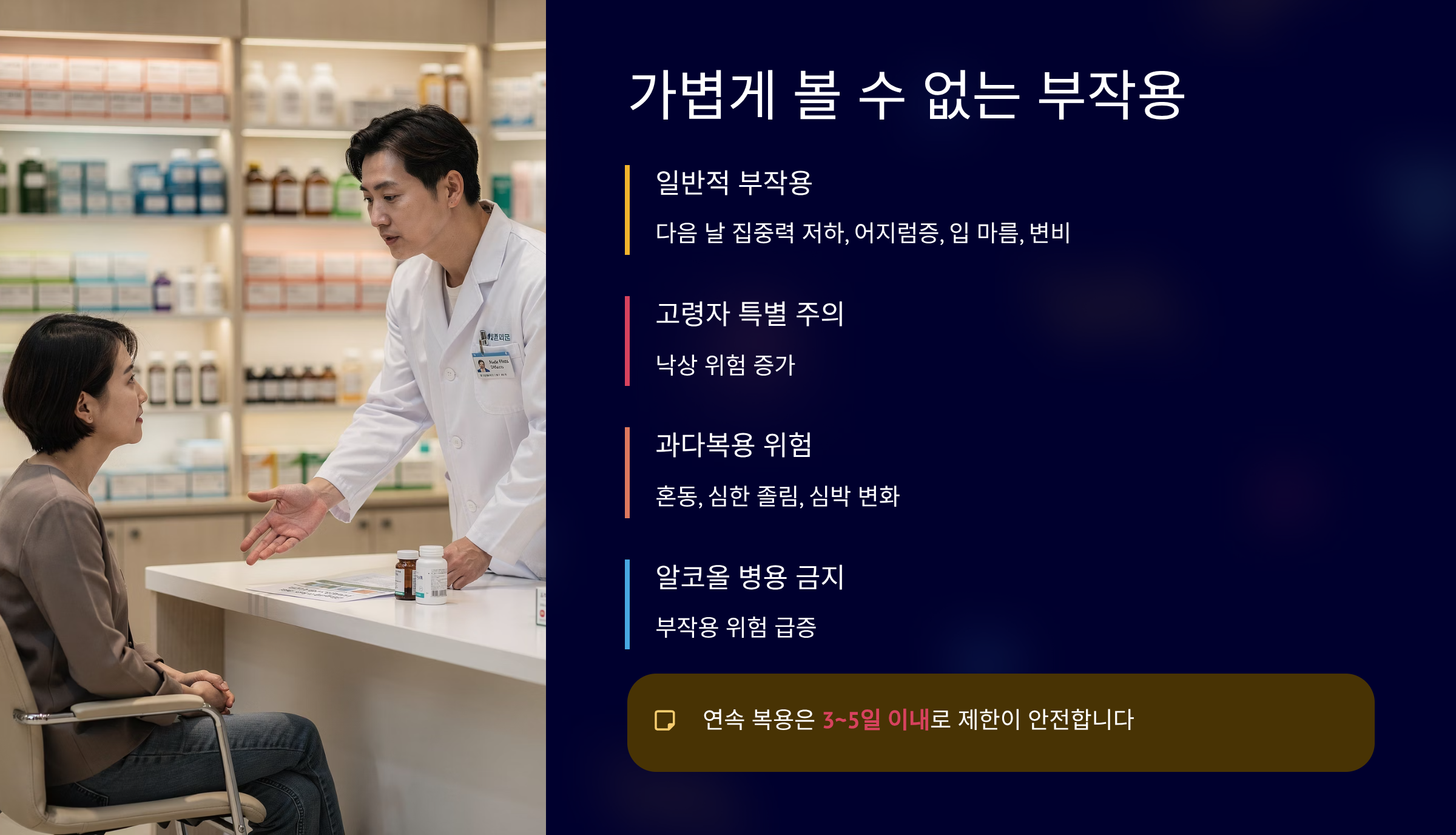 다음 날 집중력 저하, 어지럼, 입 마름, 변비가 나타날 수 있어요.