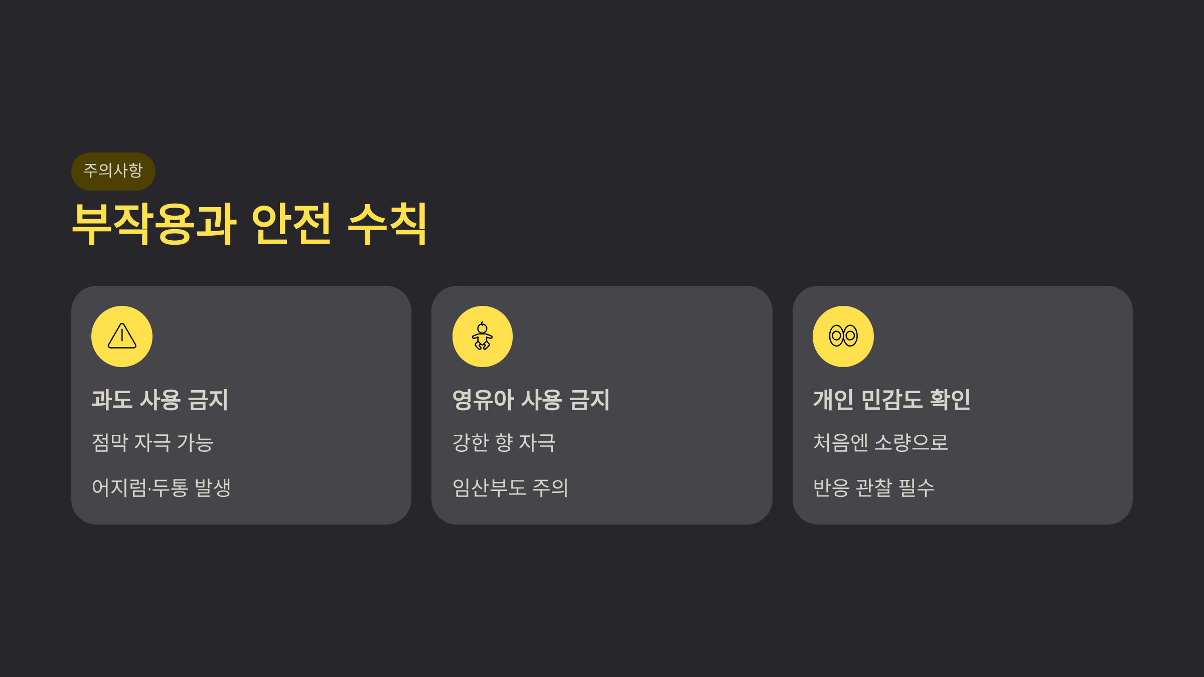 강한 향이 반드시 더 좋은 효과를 의미하지는 않습니다. 개인 취향과 자극 민감도에 맞추는 것이 중요합니다.