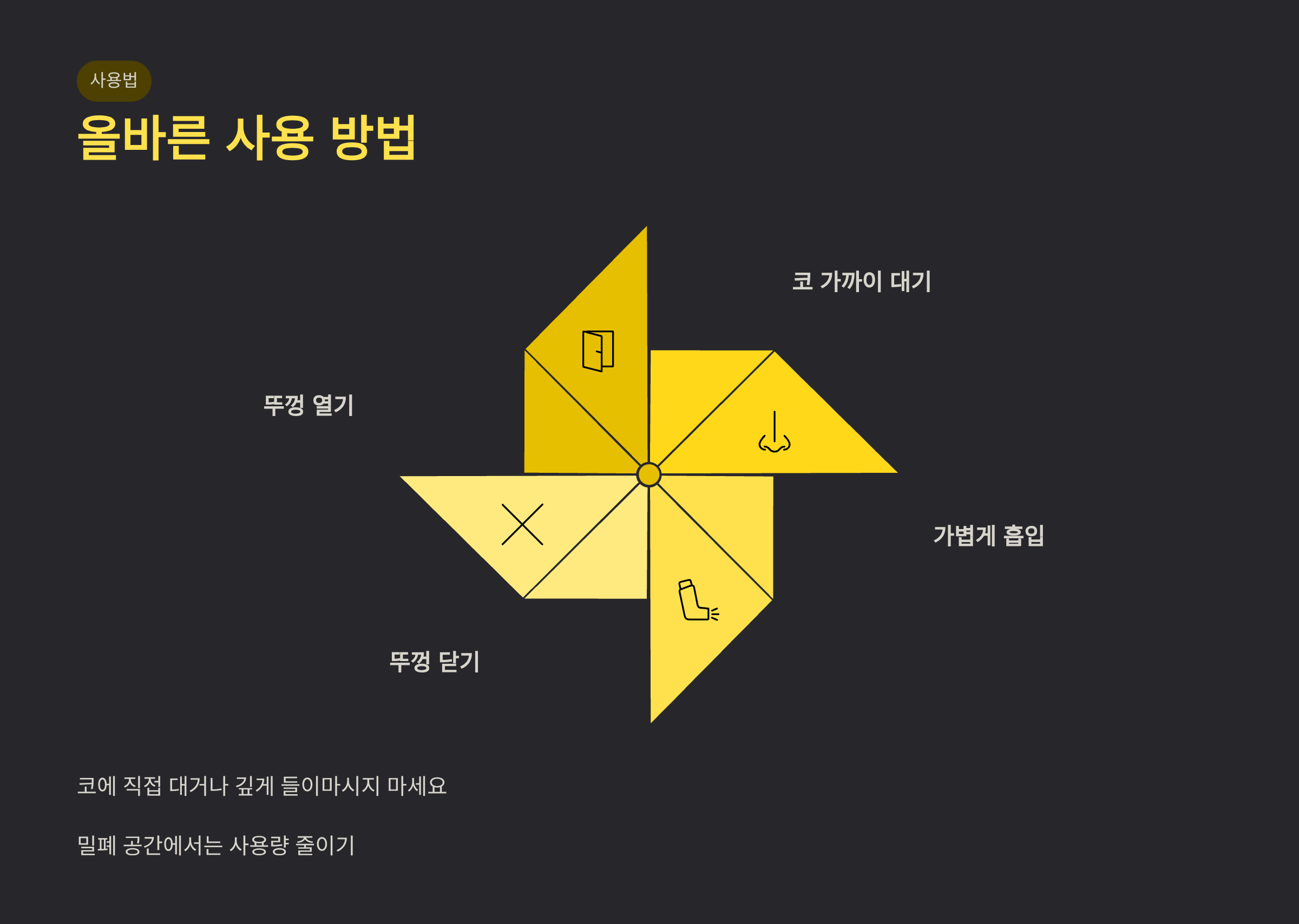 코에 직접 대거나 깊게 들이마시는 것은 권장되지 않습니다.