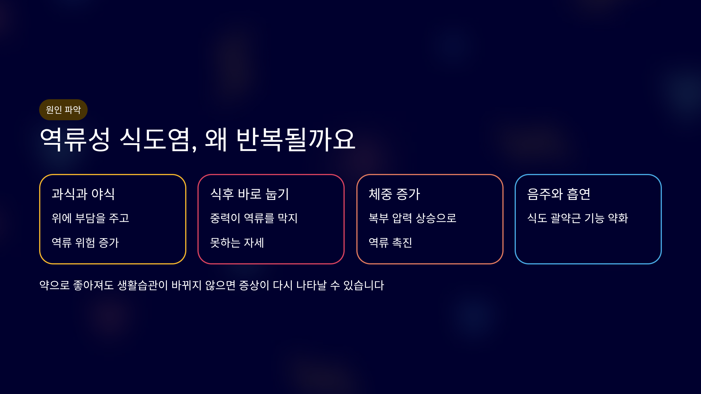 역류성 식도염 만성화의 핵심은 바로 이 반복되는 생활 패턴에 있습니다.
