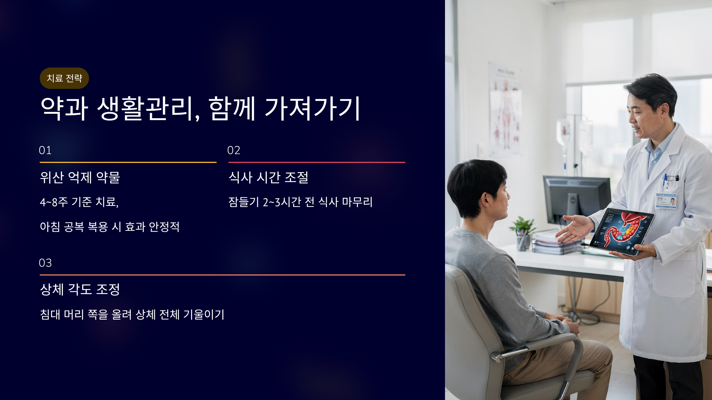 역류성 식도염 치료법은 약으로 증상을 가라앉히고, 생활관리로 재발을 줄이는 흐름이 기본입니다.