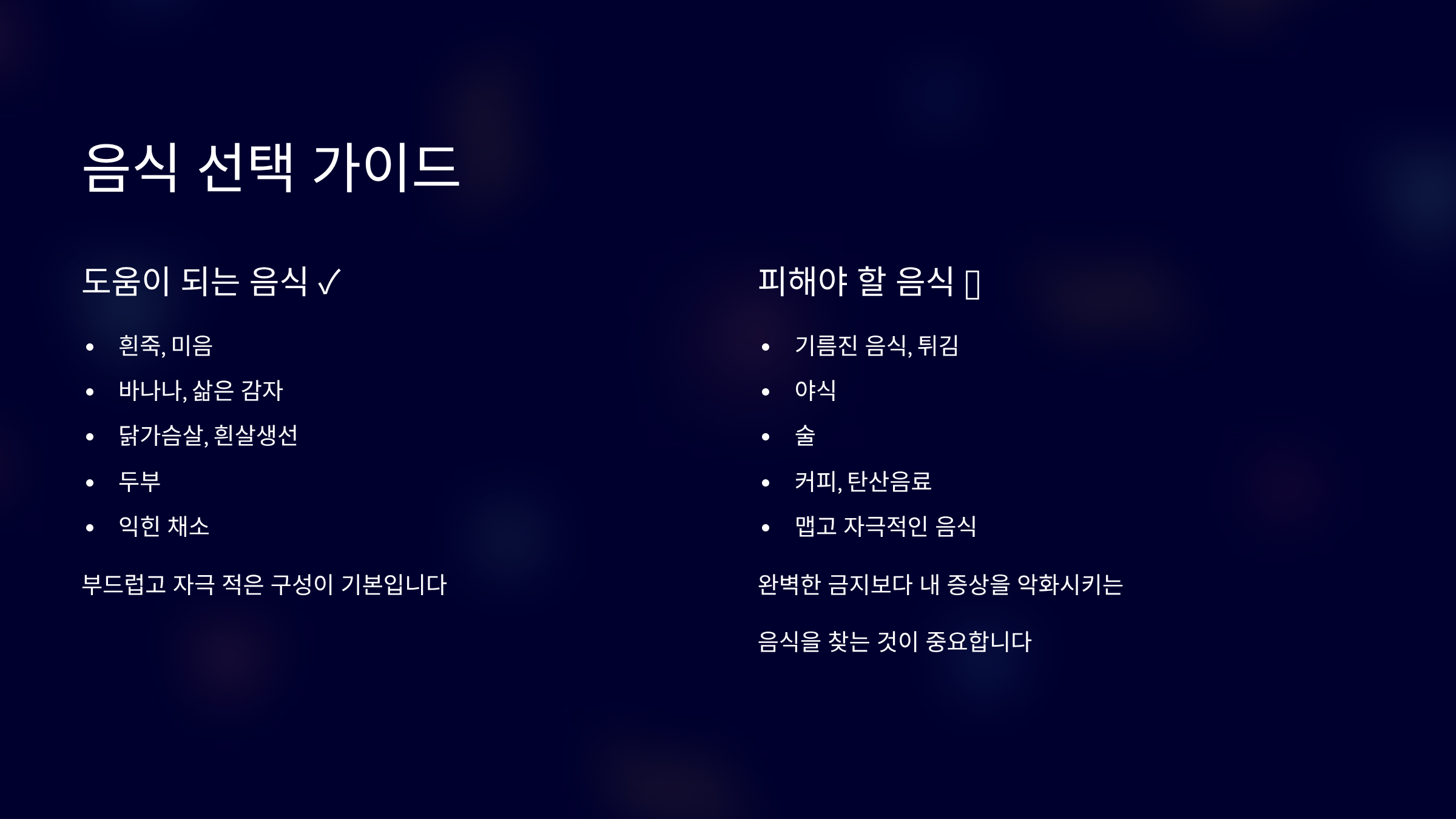 중요한 건 완벽한 금지가 아니라, 내 증상을 건드리는 음식을 찾아내는 과정입니다.