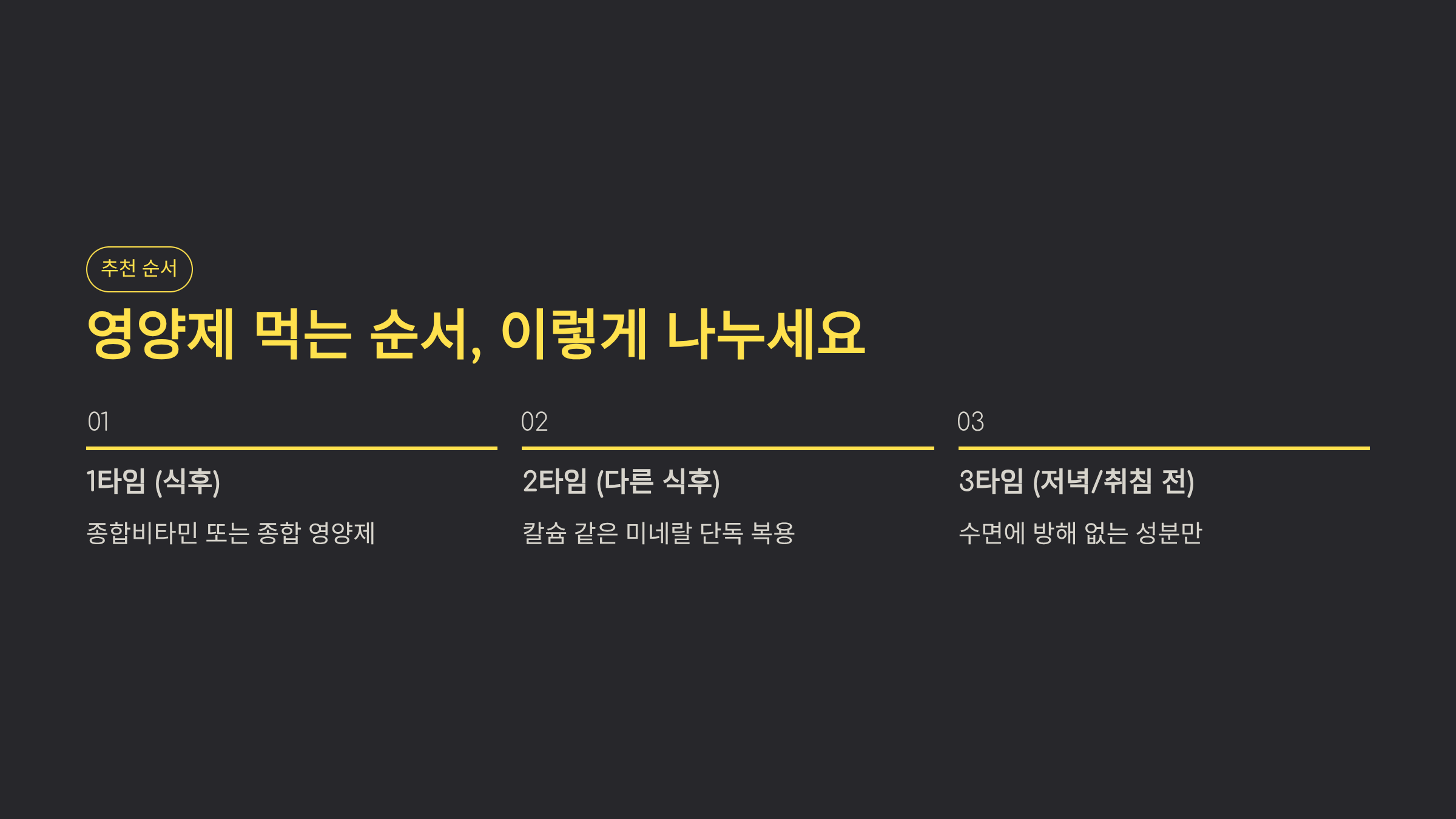 - 1타임(식후): 종합 영양제/종합비타민 - 2타임(다른 식후): 칼슘 같은 미네랄 단독 - 3타임(취침 전 or 저녁): 수면에 방해 없는 쪽만 이게 영양제 먹는 순서의 기본 뼈대입니다.