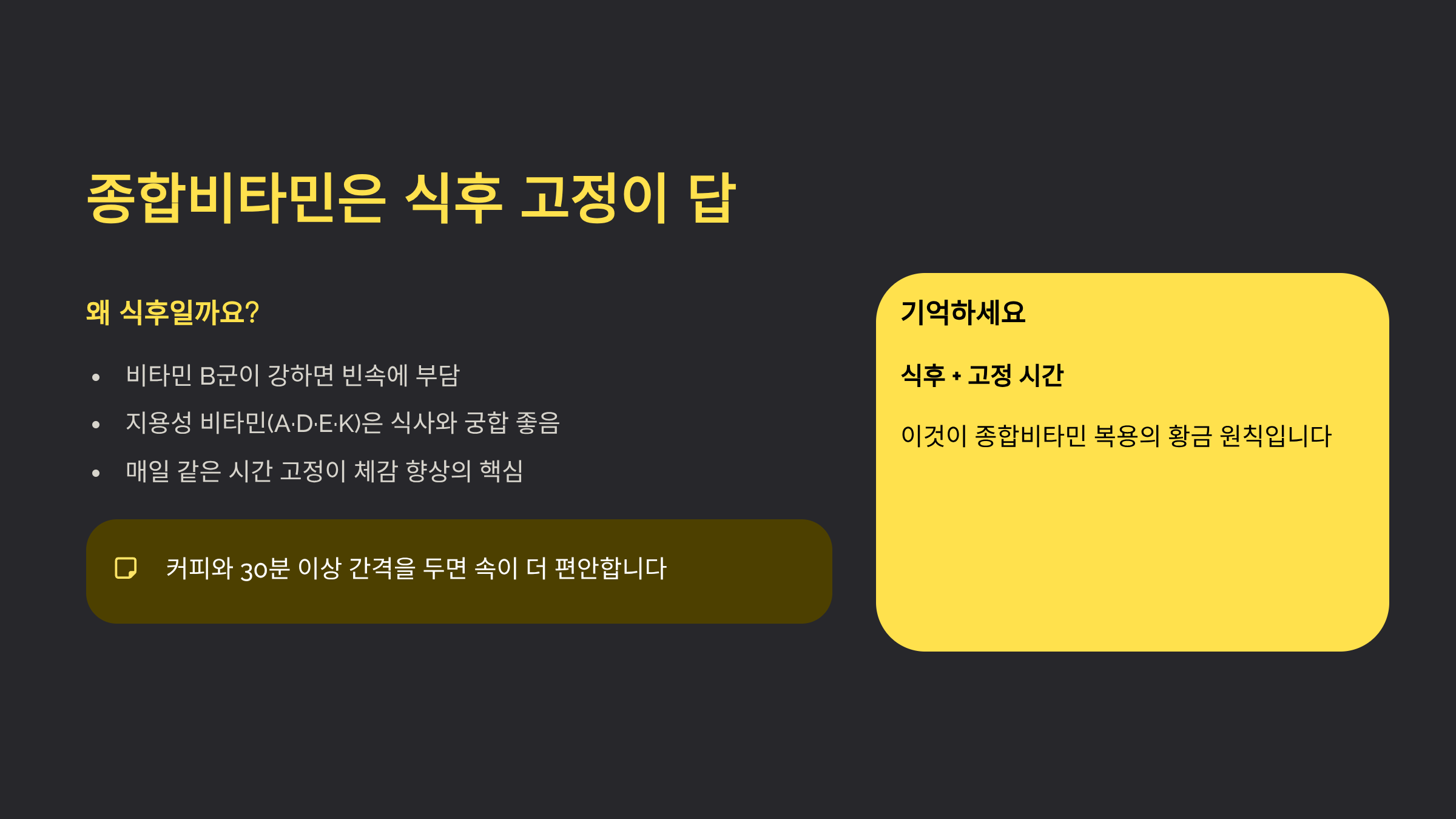 종합 영양제 먹는 시간은 결국 “식후 + 고정”이 답에 가깝습니다.