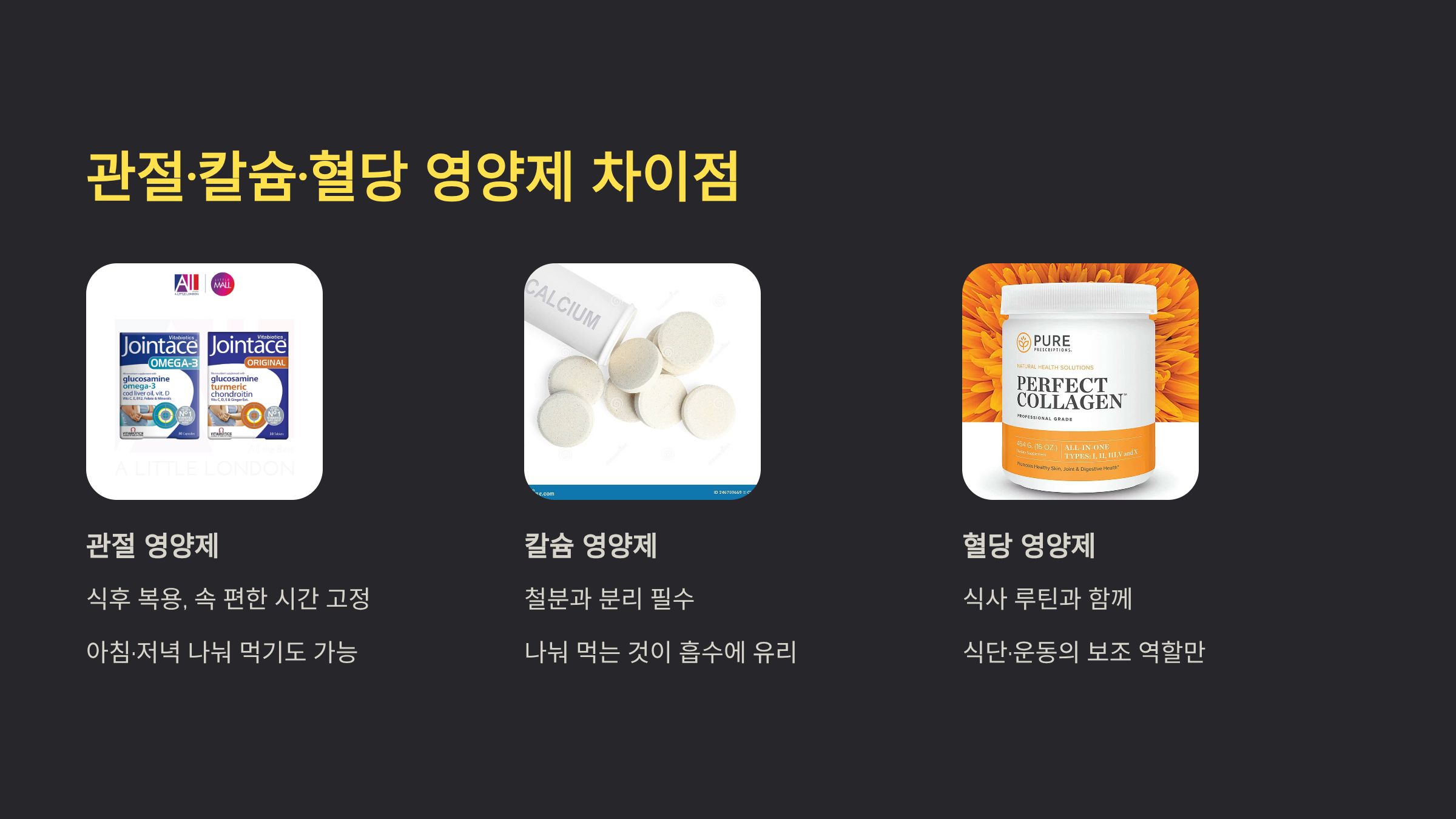 관절 영양제 먹는 시간, 혈당 영양제 먹는 시간, 칼슘 영양제 먹는 시간은 목적이 달라서 분리하는 게 편합니다.