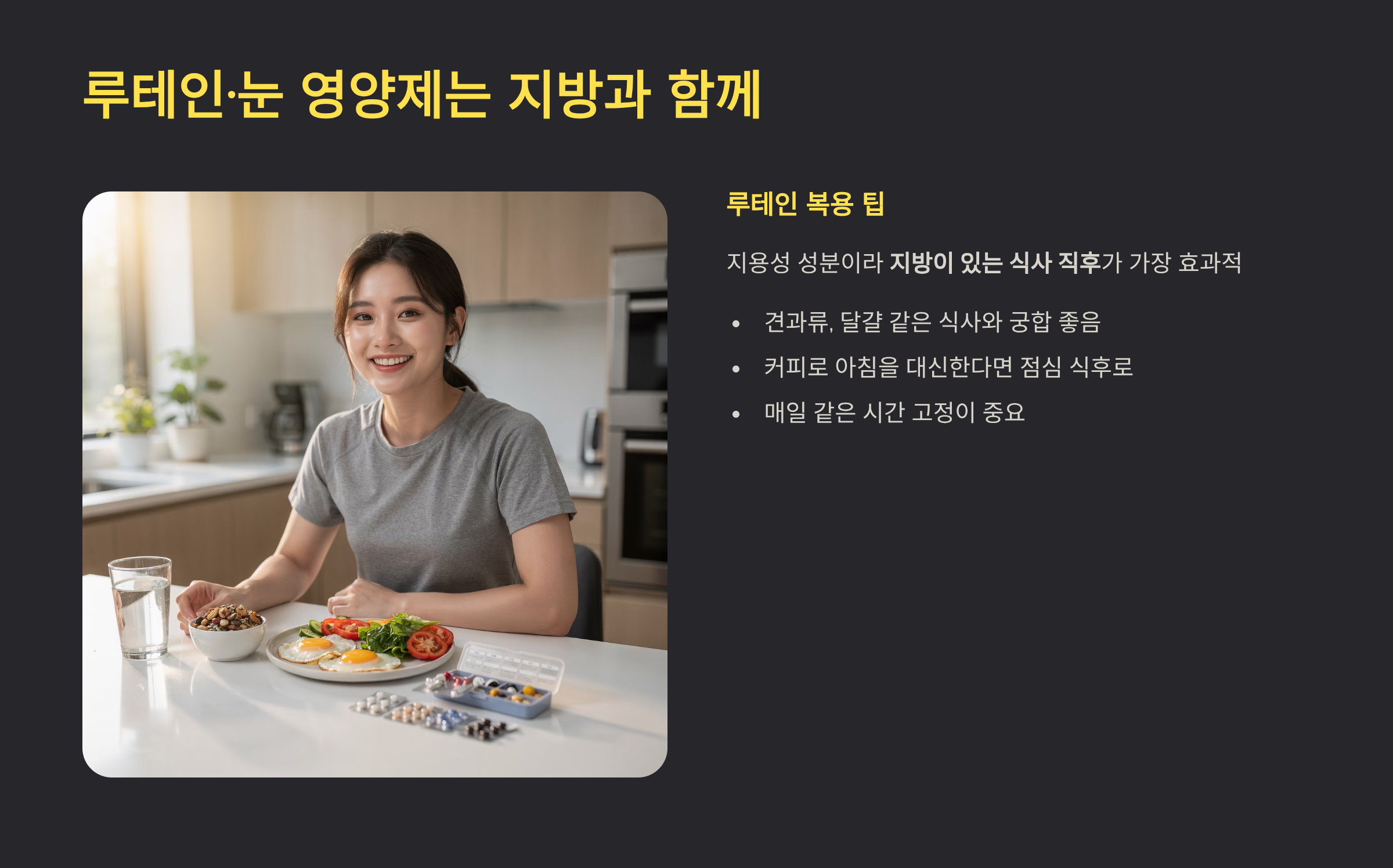 루테인 먹는 시간은 점심 식후로 고정하면 실패 확률이 많이 줄어듭니다.