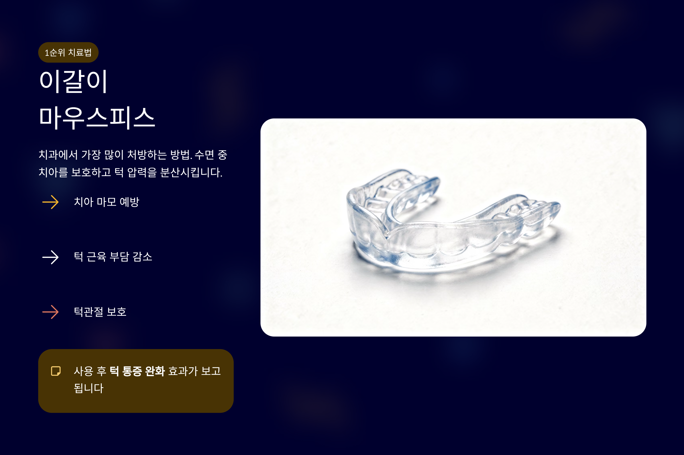 한 사례에서는 마우스피스 사용 후 턱 통증이 줄었다고 합니다.