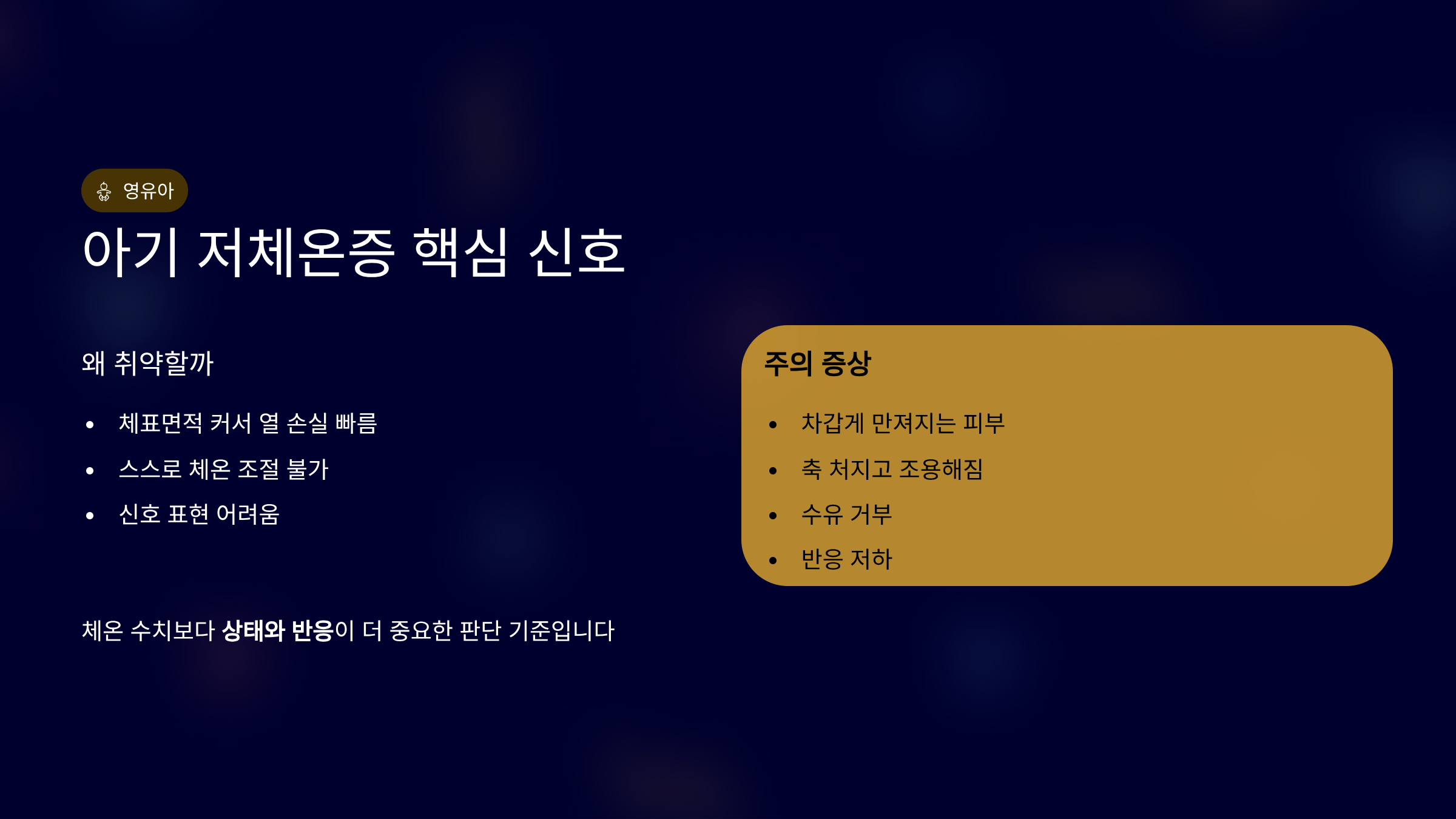 노인 저체온증은 늦게 티 나고, 아기 저체온증은 조용히 진행됩니다.