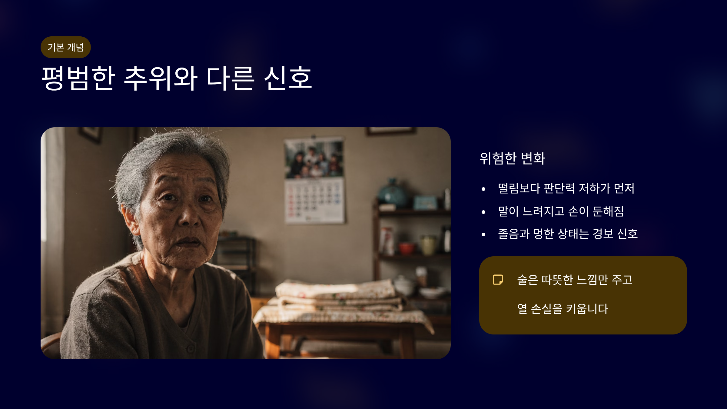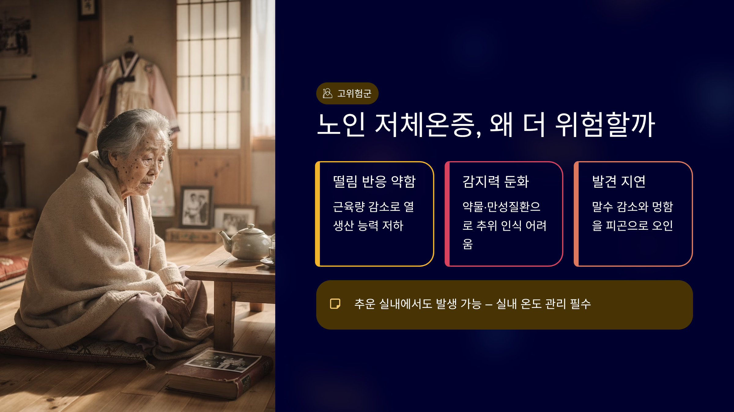 노인 저체온증은 떨림이 약하고, 의식 변화가 먼저 오는 경우가 많습니다.