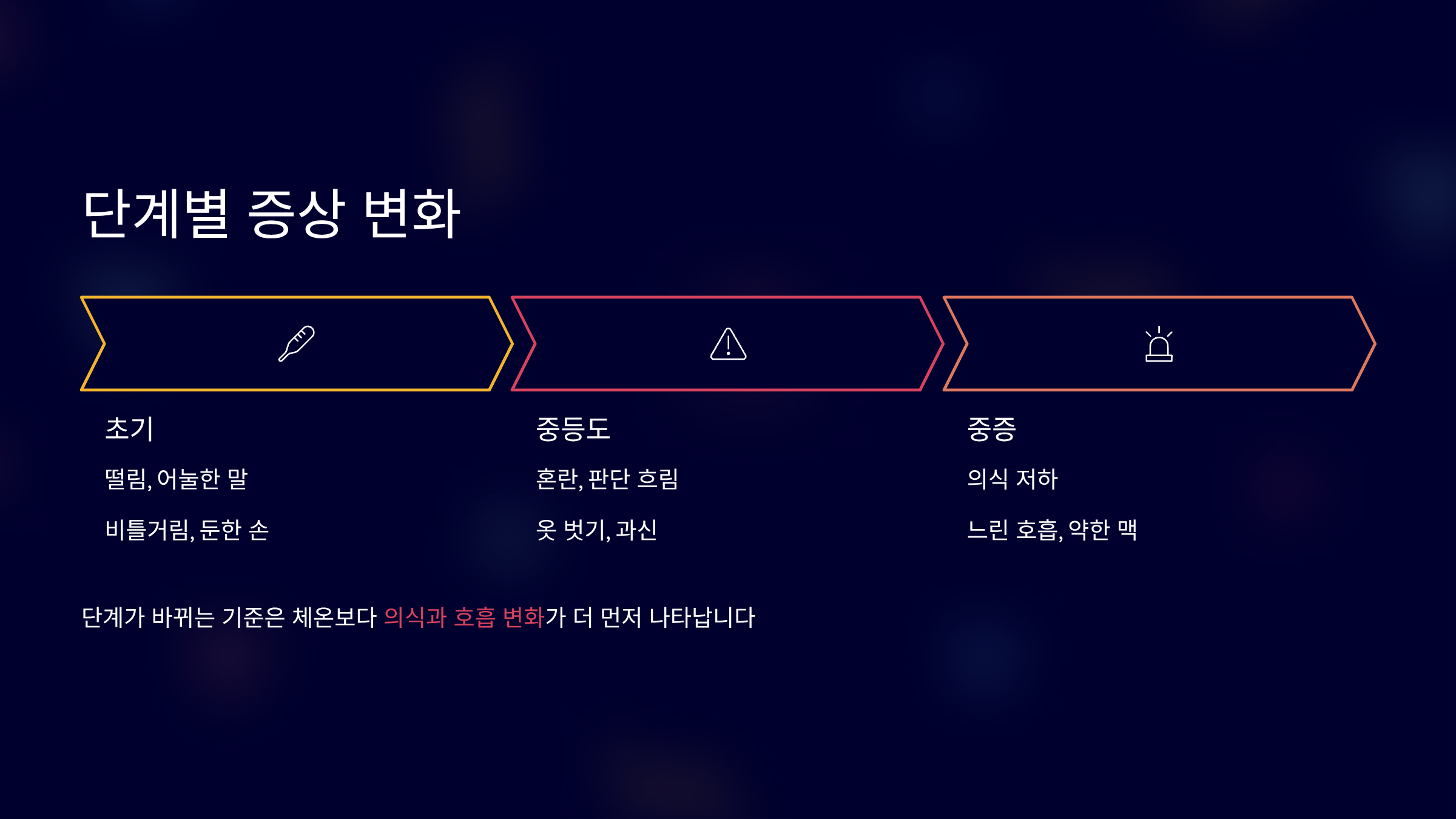 단계가 바뀌는 기준은 체온보다, 의식과 호흡 변화가 더 먼저 눈에 띕니다.