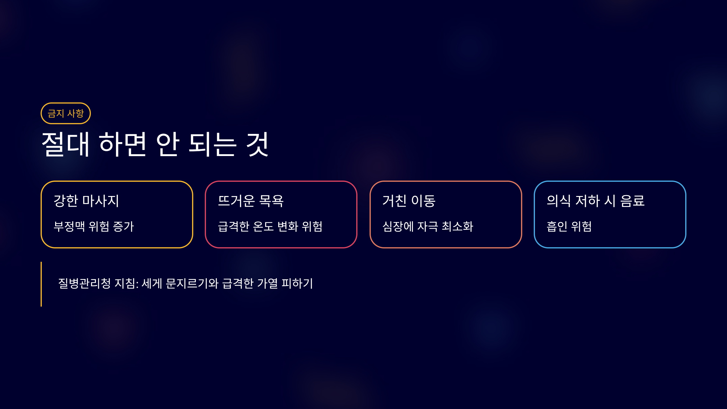 질병관리청과 정부 안내에서는 마사지나 세게 문지르기를 피하라고 강조해요.