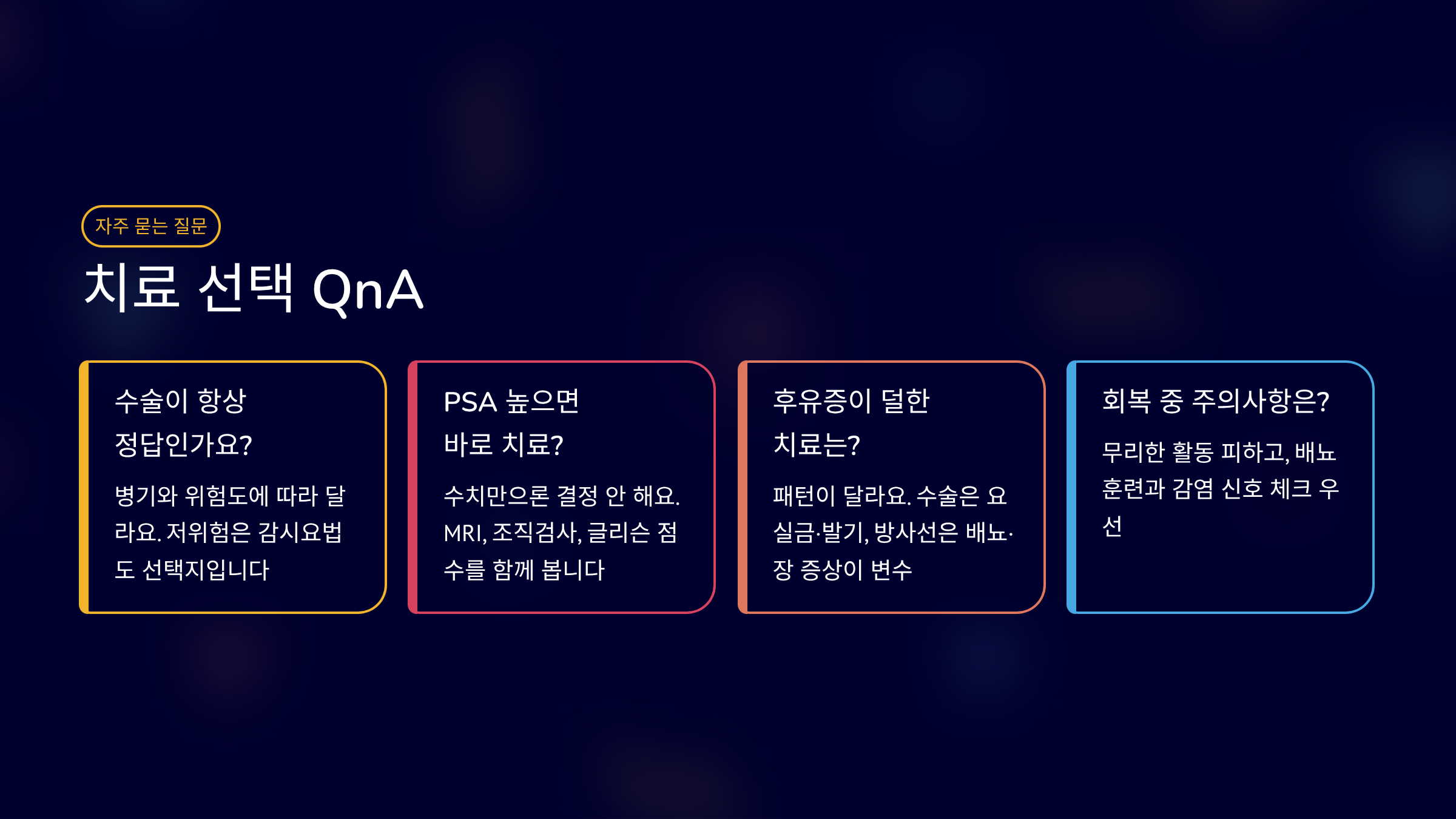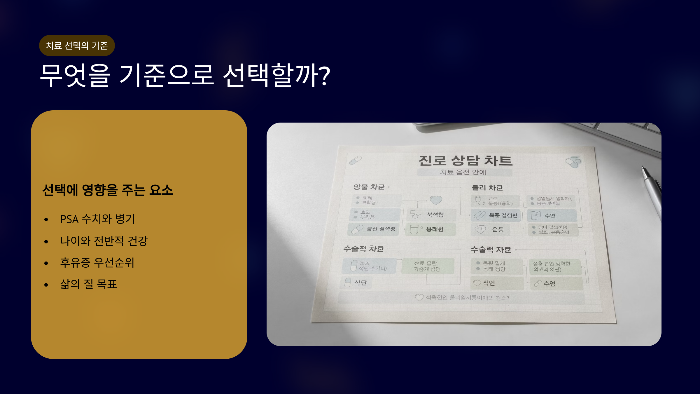 PSA 수치, 병기, 나이, 후유증 우선순위가 다 다르니까요.