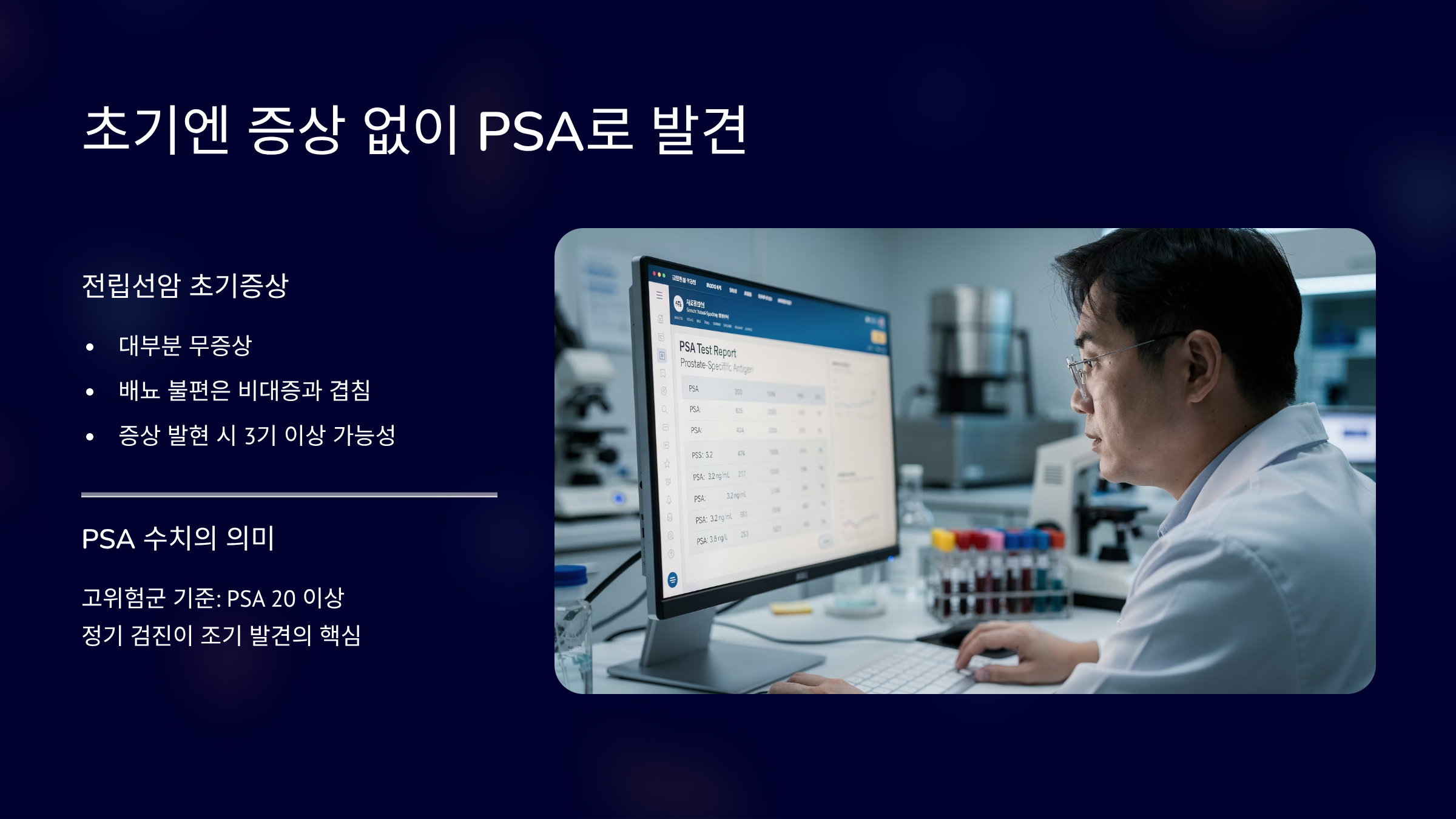 초기엔 증상이 거의 없고, PSA 검사로 먼저 잡히는 경우가 많습니다.