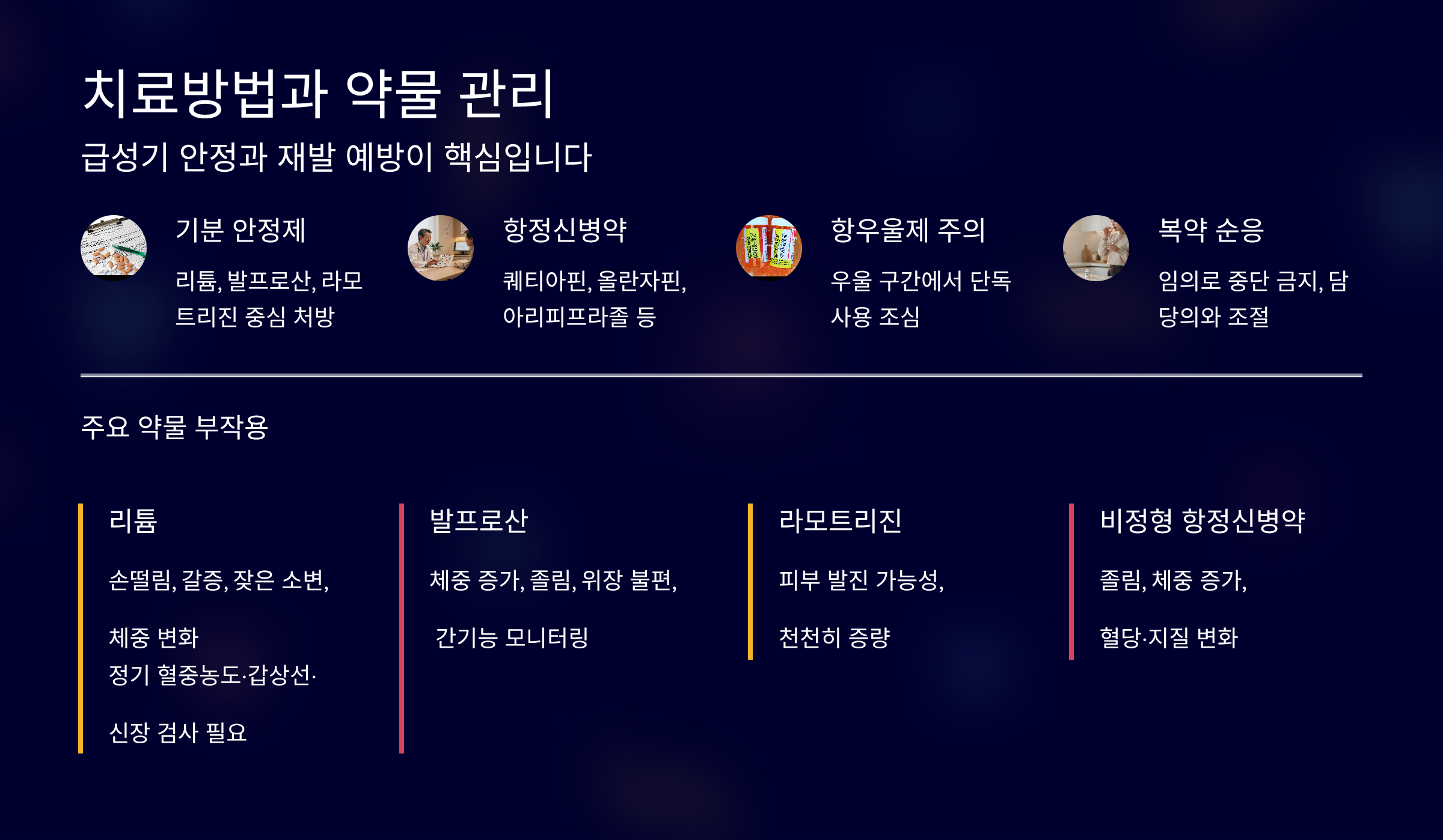 - 리튬: 손떨림, 갈증, 잦은 소변, 체중 변화, 정기적 혈중농도·갑상선·신장 체크 필요