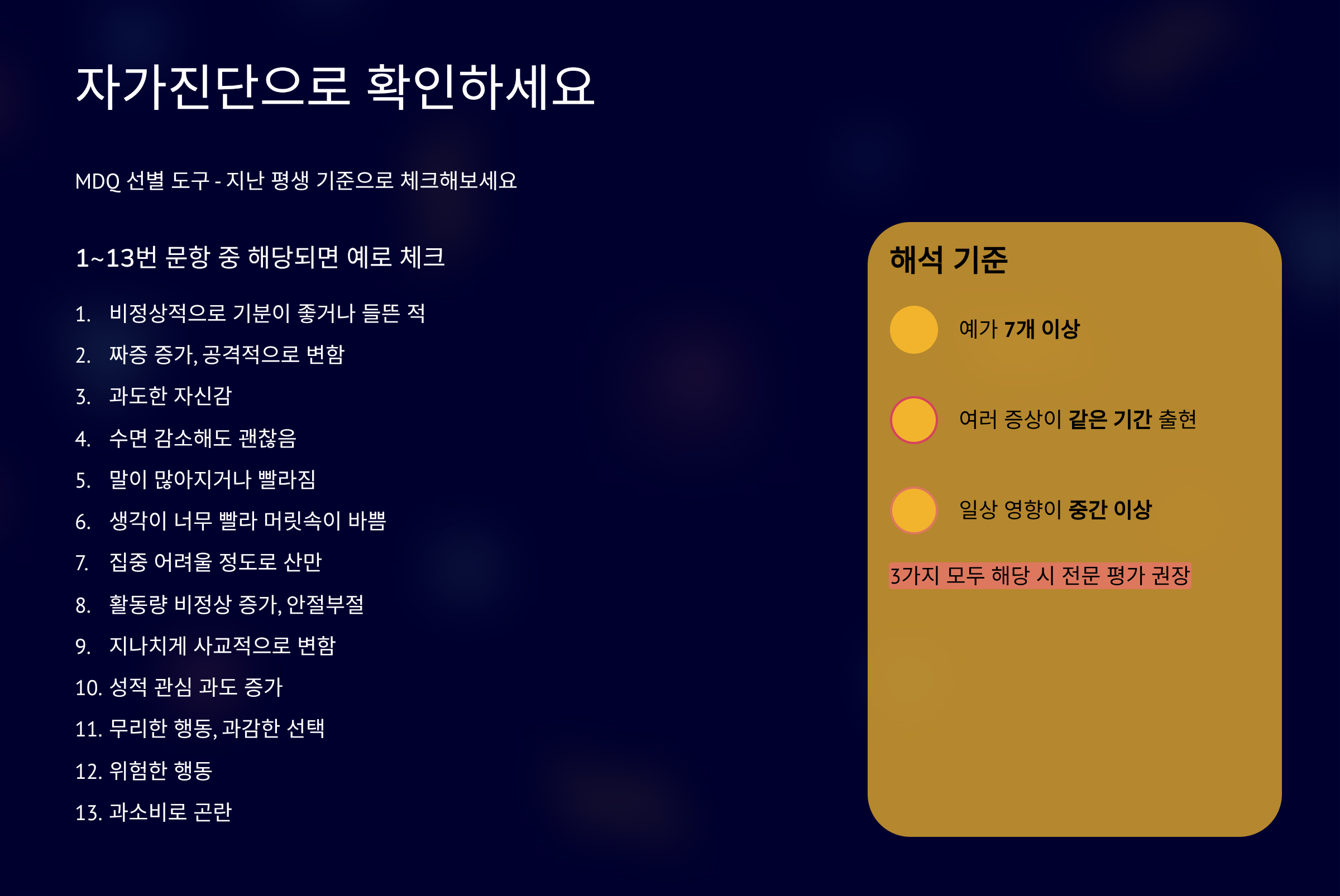 MDQ 자가진단 문항 (지난 평생 기준)