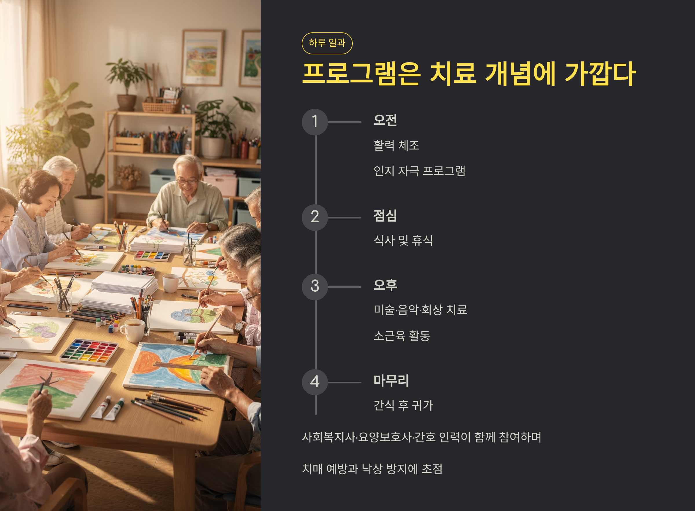 - 오후: 미술·음악·회상 치료, 소근육 활동