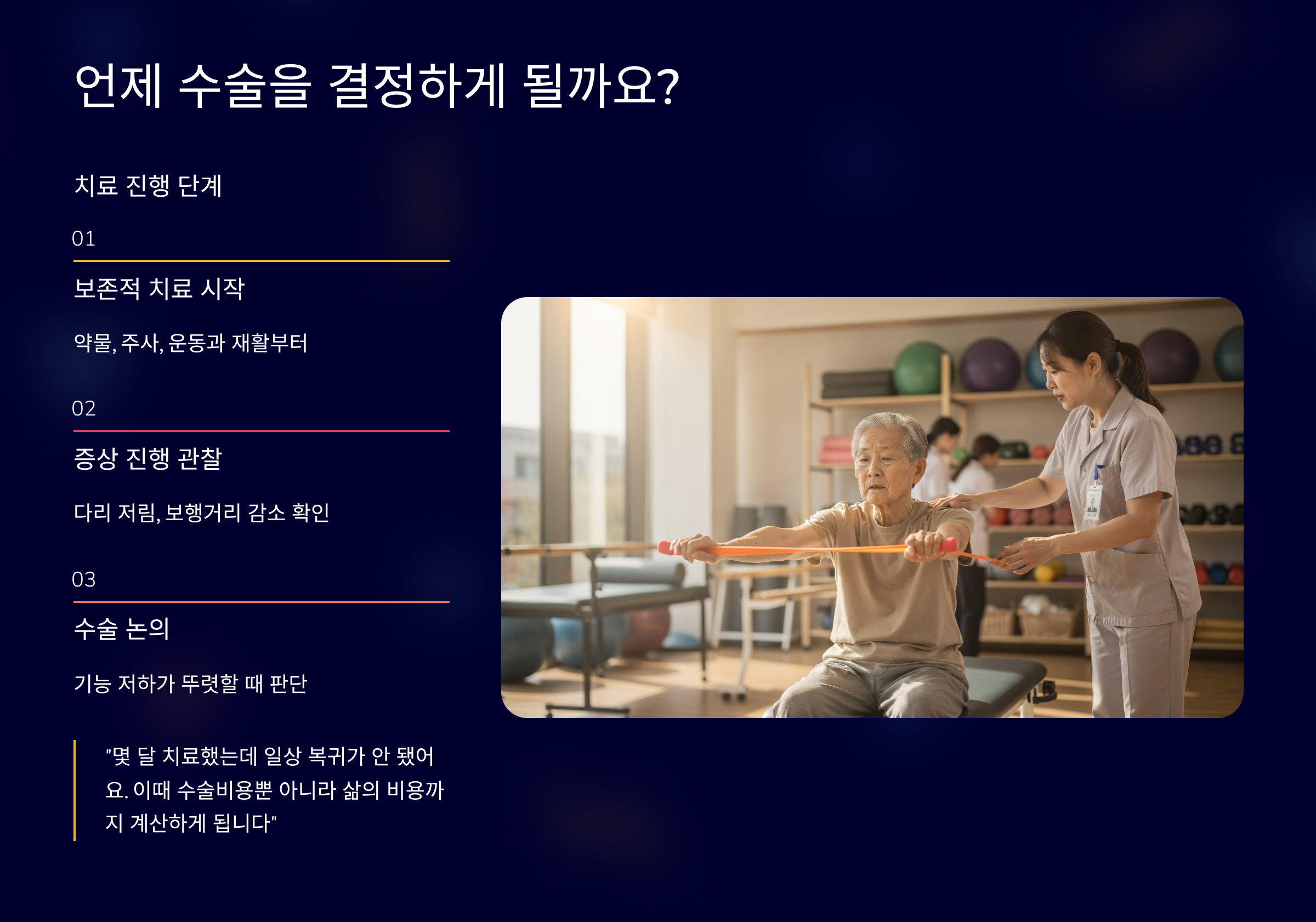 다리 저림이 심해지고 보행거리 감소가 뚜렷하면 수술 논의가 빨라집니다.