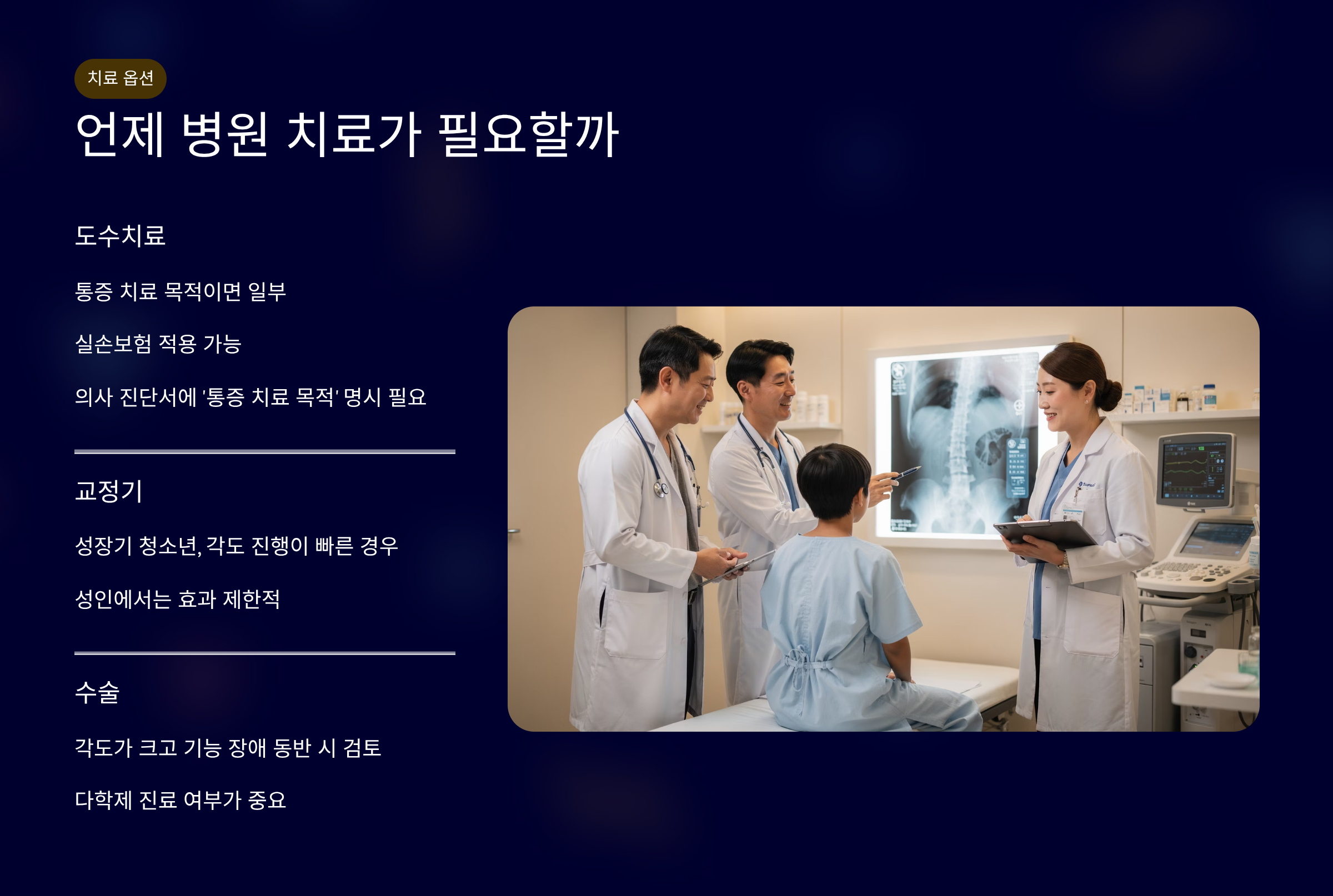 다만 미용·자세교정 목적은 보험 적용이 어려운 경우가 많습니다.