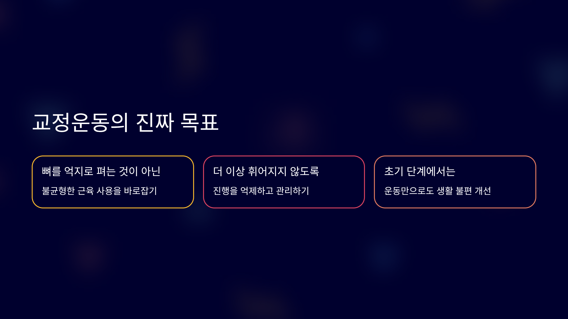 교정운동의 목적은 휘어진 뼈를 억지로 펴는 것이 아닙니다.