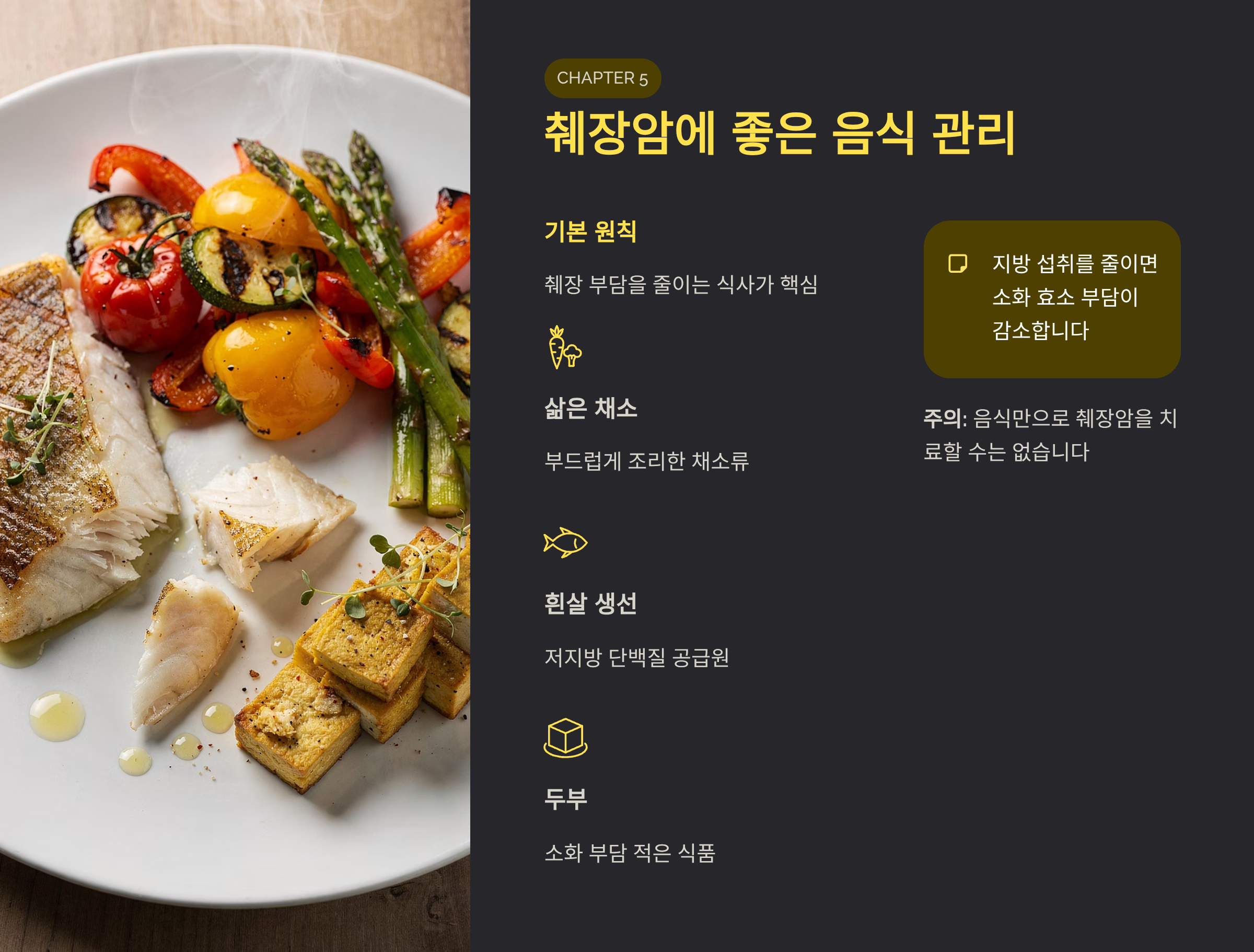 삶은 채소, 흰살 생선, 두부가 권장됩니다.