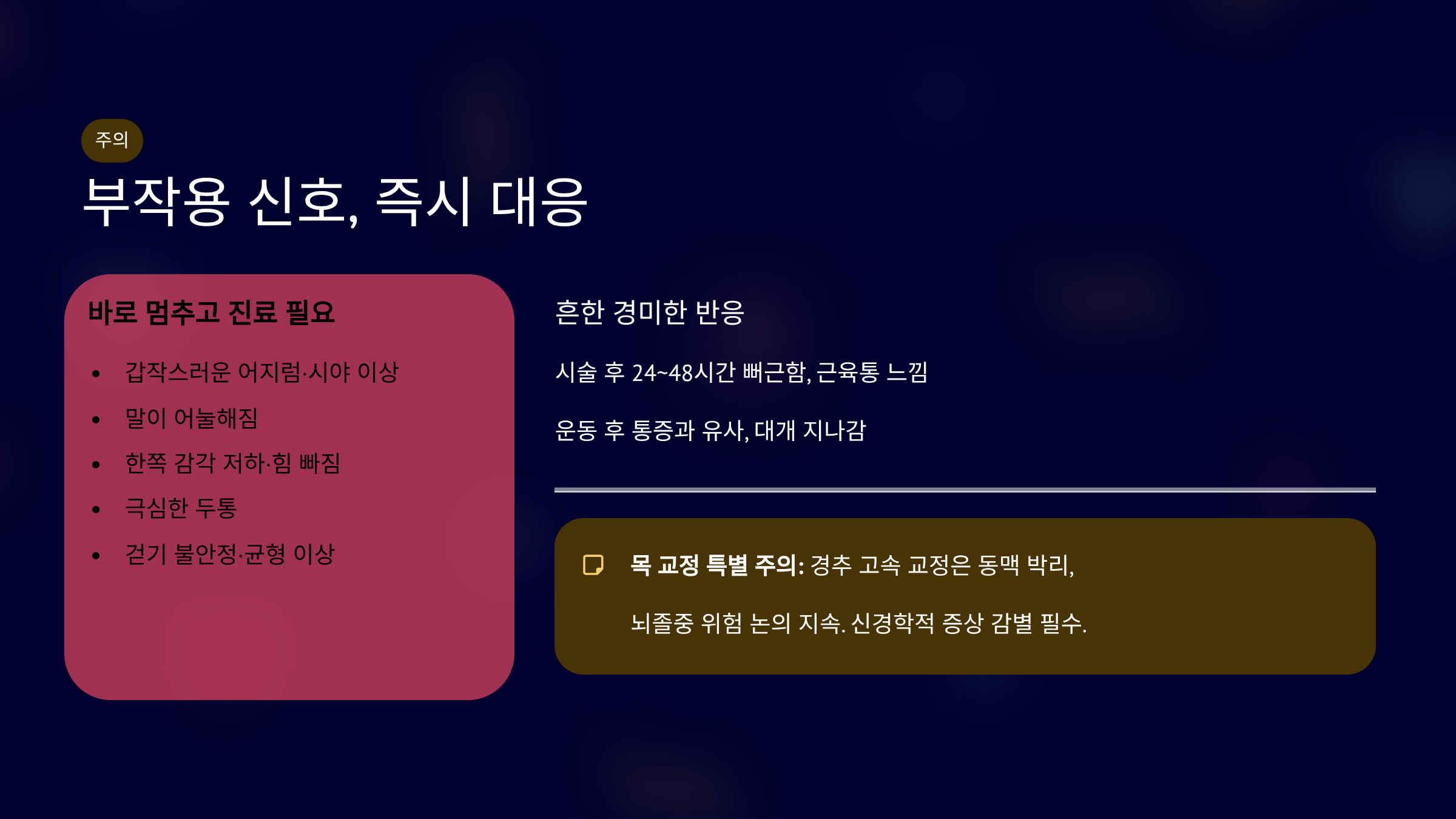 특히 목 교정 뒤 이런 증상이 나타나면 지체하지 않는 게 안전합니다.