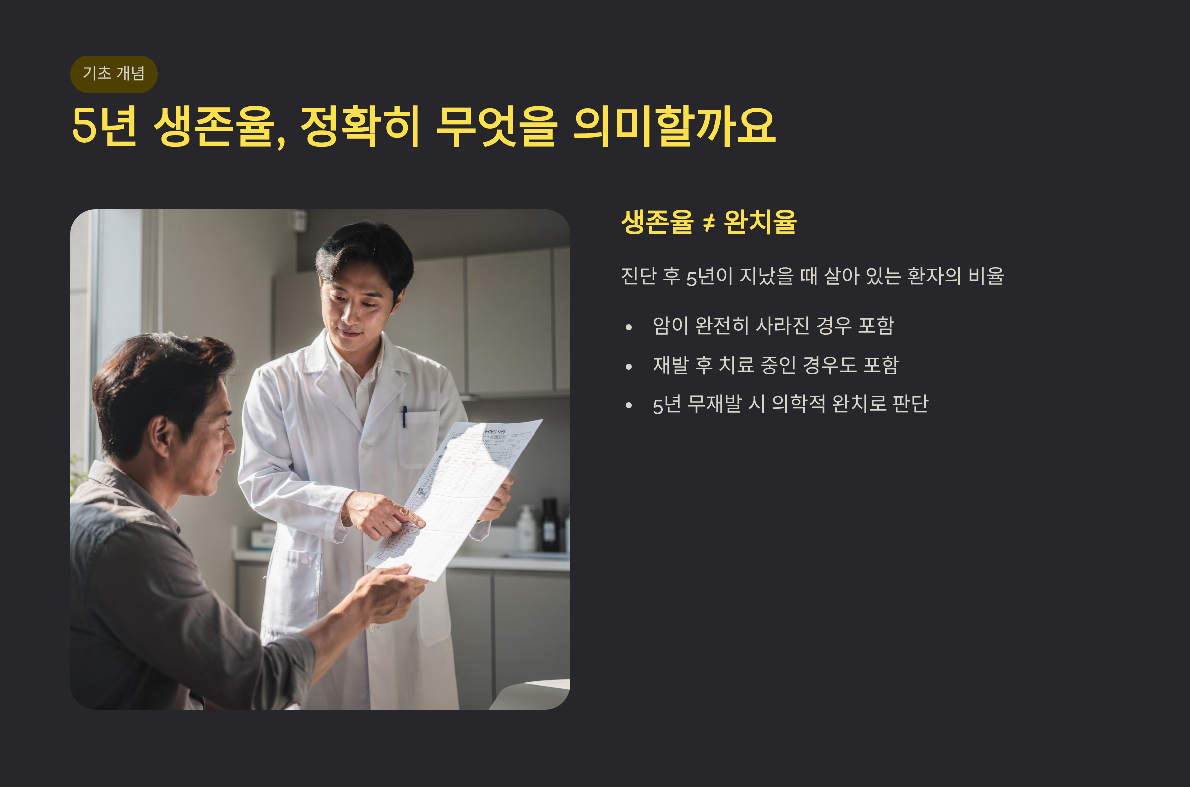 5년 생존율의 의미부터 정확하게 짚고 넘어갑니다.